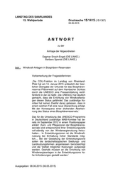 "content": "LANDTAG DES SAARLANDES 15. Wahlperiode Drucksache 15/1415 (15/1367) 08.06.2015 ANTWORT zu der Anfrage der Abgeordneten Dagmar Ensch-Engel (DIE LINKE.) Barbara Spaniol (DIE LINKE.) betr.: Windkraft-Anlagen in Biosphären-Reservaten Vorbemerkung der Fragestellerinnen: „Die CDU-Fraktion im Landtag von Rheinland- Pfalz hat am 14. Januar 2015 anlässlich der feier- lichen Übergabe der Urkunde für das Biosphären- reservat Pfälzerwald auf dem Hambacher Schloss durch die UNESCO eine Pressemitteilung veröf- fentlicht in der es heißt: ‚Die UNESCO hat deutlich gemacht, dass die Errichtung von Windkraftanla- gen diesen Status gefährdet. Das zuständige Ko- mitee hat keinen Zweifel daran gelassen, dass in einem solchen Fall eine neue Überprüfung erfolgt. Mit der Konsequenz einer drohenden Aberken- nung des Status eines Biosphärenreservats.‘ Das für die Umsetzung des UNESCO-Programms in Deutschland zuständige MAB-Komitee hat be- reits im September 2012 in einem Positionspapier erklärt: ‚Kern- und Pflegezonen der Biosphärenre- servate sind entsprechend ihrer Entwicklungsziele voll-ständig von der Windenergienutzung freizu- halten... In Entwicklungszonen ist die Windkraft- nutzung bei Einhaltung hoher Standards mög- lich… Bei der Gestaltung der Entwicklungszone sollen die landschaftstypischen Siedlungs- und Landnutzungsformen angemessen berücksichtigt und die Vielfalt möglicher Nutzungen aufgezeigt werden. Deshalb müssen an die Errichtung von Windenergieanlagen in der Entwicklungszone ho- he Anforderungen gestellt werden.‘ Ausgegeben: 08.06.2015 (06.05.2015)",