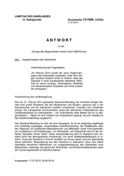 "content": "LANDTAG DES SAARLANDES 15. Wahlperiode Drucksache 15/1006 (15/945) 17.07.2014 ANTWORT zu der Anfrage des Abgeordneten Hubert Ulrich (B90/Grüne) betr.: Imagekampagne des Saarlandes Vorbemerkung des Fragestellers: „Im Februar 2014 wurde die neue Image-Kam- pagne des Saarlandes vorgestellt. Unter dem Slo- gan ‚Großes entsteht immer im Kleinen‘ wirbt das Saarland in einer bundesweiten Marketing Offen- sive für seine Vorzüge. Verschiedene Verbände und Gewerkschaften kritisierten die hohen Kosten der Kampagne.“ Vorbemerkung der Landesregierung: Das am 21. Februar 2014 gestartete Saarland-Marketing hat innerhalb weniger Mo- nate eine große Akzeptanz bei den Bürgerinnen und Bürgern, genauso wie in der Saarwirtschaft und bei zahlreichen weiteren Institutionen, Vereinen und Verbänden erlangt. Die transparente Kommunikation sowie die zahlreichen Präsentationen des Landesmarketings vor Interessierten – von Unternehmen über Medien bis hin zu Bür- germeistern – haben für eine Vielzahl von Unterstützern gesorgt, die sich freiwillig für das Saarland-Marketing engagieren. Das Saarland-Marketing ist mehr als eine Kampagne. Es ist ein langfristig tragfähiges und nachhaltig angelegtes, crossmediales Standortmarketing. Der Wettbewerb unter den Regionen um qualifizierte Mitarbeiterinnen und Mitarbeiter sowie Führungskräfte, um Investitionen und Ansiedlungen, um Wirtschafts- und Steuerkraft wird für die ein- zelnen Standorte immer härter. Diese Herausforderung wird im Saarland noch ver- stärkt durch die demografische Entwicklung. Um seine Wettbewerbsfähigkeit zu si- chern, muss das Saarland in Zukunft verstärkt auf Zuzug setzen und sich gleichzeitig darum bemühen, Abwanderung aus dem Saarland zu reduzieren. Dazu sind neben nachhaltig wirksamen Maßnahmen zur Imageverbesserung des Saarlandes auch Maßnahmen notwendig, die gezielt den Wirtschafts- und Wissenschaftsstandort sowie die Tourismuspotentiale im Saarland stärken. Ausgegeben: 17.07.2014 (16.06.2014)",