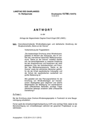 "content": "LANDTAG DES SAARLANDES 15. Wahlperiode Drucksache 15/786 (15/673) 13.02.2014 ANTWORT zu der Anfrage der Abgeordneten Dagmar Ensch-Engel (DIE LINKE.) betr.: Grenzüberschreitende Windkraftplanungen und ästhetische Zerstörung der Skulpturenstraße „Steine an der Grenze“ Vorbemerkung der Fragestellerin: „Die beabsichtigte Errichtung eines Windindustrie- gebietes im Bereich des Saargaues, das im Um- feld des international bekannten Bildhauersympo- siums \"Steine an der Grenze\" installiert werden soll, hat berechtigterweise zu massiver Empörung bei den Anwohnerinnen und Anwohnern der nahe gelegenen Orte, bei Verantwortlichen und Freun- den des Bildhauersymposiums \"Steine an der Grenze\" sowie bei zahlreichen Menschen geführt, für die der Erhalt saarländischer Kulturgüter und der Schutz der saarländischen Landschaft von großer Bedeutung ist.“ Wie gestaltet sich das Planungsverfahren für die Errichtung von Windkraftanlagen auf französi- schem Staatsgebiet ganz allgemein und welche Möglichkeiten der Beteiligung von saarländischer Seite (Öffentlichkeit, Behörden, sonstige Träger öffentlicher Belange) existieren (bitte umfassende Darstellung)? Zu Frage 1: Bei der Errichtung eines Onshore-Windenergieprojekts in Frankreich ist eine Bauge- nehmigung erforderlich: Ferner spielt die Umweltverträglichkeitsprüfung (UVP) eine wichtige Rolle; dabei ist die Berücksichtigung von Umweltbelangen während der gesamten Projektdauer zu ge- währleisten. Ausgegeben: 13.02.2014 (13.11.2013)",
