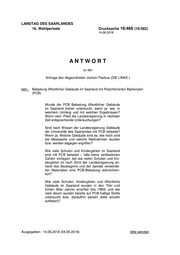 "content": "LANDTAG DES SAARLANDES 16. Wahlperiode Drucksache 16/466 (16/382) 14.06.2018 ANTWORT zu der Anfrage des Abgeordneten Jochen Flackus (DIE LINKE.) betr.: Belastung öffentlicher Gebäude im Saarland mit Polychlorierten Biphenylen (PCB) Wurde die PCB Belastung öffentlicher Gebäude im Saarland bisher untersucht, wenn ja: wie, in welchem Umfang und mit welchen Ergebnissen? Wenn nein: Plant die Landesregierung in nächster Zeit entsprechende Untersuchungen? Sind nach Wissen der Landesregierung Gebäude der Universität des Saarlandes mit PCB belastet? Wenn ja: Welche Gebäude sind es, wie hoch sind die Messwerte und welche Maßnahmen wurden bzw. werden dagegen ergriffen? Wie viele Schulen und Kindergärten im Saarland sind mit PCB belastet – falls keine verlässlichen Zahlen vorliegen: bei wie vielen Schulen und Kin- dergärten ist nach Sicht der Landesregierung an- hand des Baubeginns und der damals verwende- ten Materialien eine PCB-Belastung wahrschein- lich? Wie viele Schulen, Kindergärten und öffentliche Gebäude im Saarland wurden in den 70er und frühen 80er Jahren errichtet (bis 1983) und wie viele davon wurden bereits auf PCB-haltige Stoffe untersucht bzw. daraufhin saniert (bitte einzeln auflisten)? Ausgegeben: 14.06.2018 (04.05.2018) bitte wenden",