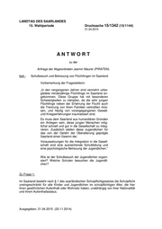 "content": "LANDTAG DES SAARLANDES 15. Wahlperiode Drucksache 15/1342 (15/1144) 21.04.2015 ANTWORT zu der Anfrage der Abgeordneten Jasmin Maurer (PIRATEN) betr.: Schulbesuch und Betreuung von Flüchtlingen im Saarland Vorbemerkung der Fragestellerin: „In den vergangenen Jahren sind vermehrt unbe- gleitete minderjährige Flüchtlinge im Saarland an- gekommen. Diese Gruppe hat mit besonderen Schwierigkeiten zu kämpfen, da die sehr jungen Flüchtlinge neben der Erfahrung der Flucht auch die Trennung von ihren Familien verkraften müs- sen, und häufig von vorangegangenen Gewalt- und Kriegserfahrungen traumatisiert sind. Es muss dem Saarland aus humanitären Gründen ein Anliegen sein, diese jungen Menschen mög- lichst schnell und gut in die Gesellschaft zu integ- rieren. Zusätzlich stellen diese Jugendlichen für das von der Gefahr der Überalterung geprägte Saarland einen Gewinn dar. Voraussetzungen für die Integration in die Gesell- schaft sind eine ausreichende Schulbildung und eine psychologische Betreuung der Jugendlichen.“ Wie ist der Schulbesuch der Jugendlichen organi- siert? Welche Schulen besuchen die Jugendli- chen? Zu Frage 1: Im Saarland besteht nach § 1 des saarländischen Schulpflichtgesetzes die Schulpflicht uneingeschränkt für alle Kinder und Jugendlichen im schulpflichtigen Alter, die hier ihren gewöhnlichen Aufenthalt oder Wohnsitz haben, unabhängig von ihrer Nationalität und ihrem Aufenthaltsstatus. Ausgegeben: 21.04.2015 (20.11.2014)",