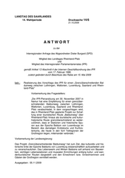"content": "LANDTAG DES SAARLANDES 14. Wahlperiode Drucksache 14/6 21.10.2009 ANTWORT zu der Interregionalen Anfrage des Abgeordneten Dieter Burgard (SPD) Mitglied des Landtages Rheinland-Pfalz und Mitglied des Interregionalen Parlamentarierrates (IPR) gemäß Artikel 13 Abschnitt 4 der Internen Geschäftsordnung des IPR vom 17. Februar 1986, zuletzt geändert durch Beschluss des Rates am 15. Mai 2009 betr.: Realisierung des Vorschlags des IPR für einen „Grenzüberschreitenden Bal- duinweg zwischen Lothringen, Wallonien, Luxemburg, Saarland und Rhein- land-Pfalz“ Vorbemerkung des Fragestellers: „Die IPR-Plenarsitzung am 30. November 2007 in Namur hat eine Empfehlung für einen grenzüber- schreitenden Balduinweg zwischen Lothringen, Wallonien, Luxemburg, Saarland und Rheinland- Pfalz verabschiedet, in dem vorgeschlagen wird, das in Rheinland-Pfalz geplante Projekt zur Schaf- fung einer touristischen Route „Balduinweg“ über Rheinland-Pfalz hinaus als touristische und kultur- historische Route grenzüberschreitend so weiter- zuführen, dass er Stationen und historische Spu- ren aus der Epoche Balduin von Luxemburgs im Bereich des damaligen Erzbistums und Kurfürs- tentums, die heute in den fünf Teilregionen der Großregion liegen, miteinander verbindet.“ Vorbemerkung der Landesregierung: Das Projekt „Grenzüberschreitender Balduinweg“ hat zum Ziel, das kulturelle und his- torische Erbe der Epoche Balduins von Luxemburg wissenschaftlich aufzuarbeiten und zu veranschaulichen. Das Lebenswerk und Wirken Balduins soll anhand von Bauwer- ken, wichtigen Lebensstationen und musealen Einrichtungen entlang kultur- und wan- dertouristischer Routen dargestellt und den Einwohnern bzw. Einwohnerinnen und Gästen der Großregion vermittelt werden. Ausgegeben: 05.11.2009",