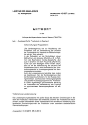 "content": "LANDTAG DES SAARLANDES 15. Wahlperiode Drucksache 15/857 (15/800) 04.04.2014 ANTWORT zu der Anfrage der Abgeordneten Jasmin Maurer (PIRATEN) betr.: Ausstiegshilfe für Prostituierte im Saarland Vorbemerkung der Fragestellerin: „Die Landesregierung hat zur Regulierung der Prostitution und zur Verbesserung der Situation der Prostituierten im Saarland ein Maßnahmenpa- ket auf den Weg gebracht. In der Diskussion um die Sinnhaftigkeit dieser Maßnahmen, die teilweise öffentlich, z.B. im Rah- men des Saarbrücker Caritas-Gesprächs, aber auch in Gremien wie dem Frauenrat geführt wird, wurde von allen Beteiligten immer wieder betont, dass es für die Verbesserung der Situation der Prostituierten und für eine Verminderung der Pros- titution essentiell ist, Ausstiegsangebote und Bera- tungsstellen anzubieten. Auch die Landesregierung bekräftigt dies, indem sie beschlossen hat, die Bundesregierung über den Bundesrat aufzufordern, für den Ausbau nied- rigschwelliger psychosozialer Beratungsangebote und gezielter Ausstiegsprogramme für Prostituier- te sowie regelmäßige gesundheitliche Beratung für Prostituierte und Verbesserung des Zugangs zu psychosozialen Beratungsangeboten zu sor- gen.“ Vorbemerkung Landesregierung: Die Landesregierung beobachtet mit großer Sorge die aktuellen Entwicklungen im Be- reich der Prostitution, insbesondere die erhebliche Zunahme der Prostitution bei wach- senden sozialen Missständen sowie insbesondere eine erhebliche Ausweitung prob- lematischer Erscheinungsformen der Prostitution unter besonders ausbeuterischen Rahmenbedingungen. Ausgegeben: 04.04.2014 (05.03.2014)",