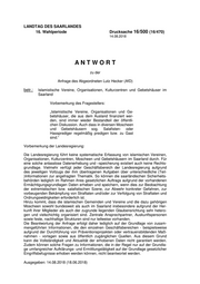 "content": "Drucksache 16/500 (16/470) Landtag des Saarlandes - 16. Wahlperiode - Wie viele islamische Vereine, Organisationen, Kul- turzentren und Gebetshäuser gibt es derzeit im Saarland (bitte aufschlüsseln nach Anzahl und Art der Organisation in den jeweiligen Kreisen und Gemeinden)? Wie viele davon gehören welchen Verbänden an, insbesondere dem Dachverband DiTiB? Zu den Fragen 1 und 2: Nach Kenntnis der Landesregierung gibt es im Saarland folgende islamische Vereine, Organisationen, Kulturzentren und Gebetshäuser: Kreis Gemeinde/ Vereine/ Moscheen/ Verband Stadt Organisati- Gebetshäu- on ser Kultur- zentren Merzig-Wadern Merzig 2 Vereine 2 Moscheen 1 Verein/1 Moschee Türkisch- Islamische Gemeinde zu Merzig e.V. (DITIB) 1 Verein/1 Moschee Islamschule Merzig e.V. St. Wendel - - - - Saarlouis Dillingen 1 Verein 1 Moschee 1 Verein/1 Moschee Türkisch- Islamischer Kultur-Verein (DITIB) Saarlouis Schmelz 1 Verein 1 Moschee 1 Verein/1 Moschee Türkisch- Islamischer Kultur-Verein (DITIB) Saarlouis Schmelz 1 Verein - 1 Verein/ Islamische Gemein- schaft Milli Görüs, Ortsverein Schmelz e.V. Neunkirchen Neunkirchen 2 Vereine 1 Moschee 1 Verein/1 Moschee Türkisch- Islamischer Kultur-Verein (DITIB) 1 Verein Sunnitische Islamische Gemeinde Neunkirchen e.V. Saar-Pfalz-Kreis Homburg 3 Vereine 3 Moscheen 1 Verein/1 Moschee Türkisch- Islamischer Kultur-Verein (DITIB) 1 Verein/ 1 Moschee Verein zur Förderung der Integration und Bildung in Homburg e.V. 1 Verein/1 Moschee Islamische Hochschulgemeinde Homburg e.V. Saar-Pfalz-Kreis St. Ingbert 2 Vereine 2 Moscheen 1 Verein/1 Moschee Türkisch- Islamischer Kultur-Verein (DITIB) 1 Verein/1 Moschee Verein zur Förderung der Integration und Bildung in St. Ingbert e.V. Regionalverband Sulzbach 3 Vereine 2 Moscheen 2 Vereine/1 Moschee Türkisch- Saarbrücken Islamischer Kultur-Verein (DITIB) 1 Verein/1 Moschee Muslimische Gemeinde Saar e.V. -2-",