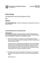 "content": "SCHLESWIG-HOLSTEINISCHER LANDTAG Drucksache 18/1419 18. Wahlperiode 2013-12-20 Kleine Anfrage des Abgeordneten Jens-Christian Magnussen (CDU) und Antwort der Landesregierung – Minister für Energiewende, Landwirtschaft, Umwelt und ländliche Räume Landesbergbaubehörde für Schleswig-Holstein Vorbemerkung Das Landesamt für Bergbau, Energie und Geologie (LBEG) in Niedersachsen ist gleichzeitig Bergbaubehörde für Schleswig-Holstein. Es arbeiten dort 300 Mitarbeite- rinnen und Mitarbeiter für insgesamt vier norddeutsche Länder. 1. Welche Kosten würden nach Auffassung der Landesregierung entstehen, wenn das Land Schleswig-Holstein die Aufgaben des LBEG in allen Bereichen selbst organisieren würde? Derzeit wird von der Landesregierung die Möglichkeit evaluiert, die Aufgaben des LBEG auf eine schleswig-holsteinische Behörde zu übertragen. Bei der Evaluierung stehen die Ermittlung des erforderlichen Personals und die für das Land entstehenden Kosten im Vordergrund. Über das Ergebnis wird die Landesregierung den Landtag unverzüglich informieren. 2. Wie viel Personal mit welcher Qualifikation ist erforderlich, um die Aufgaben des LBEG in allen Bereichen übernehmen zu können? Bitte tabellarisch dar- stellen. Siehe Antwort zu 1.",