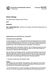 "content": "SCHLESWIG-HOLSTEINISCHER LANDTAG Drucksache 18/4167 18. Wahlperiode 20.05.2016 Kleine Anfrage des Abgeordneten Wolfgang Dudda (Piraten) und Antwort der Landesregierung – Ministerium für Soziales, Gesundheit, Wissenschaft und Gleichstellung Spiegel-Artikel vom 30.04.2016 zum „Friesenhof“ Vorbemerkung des Fragestellers: In seiner Ausgabe Nr. 18 vom 30.04.2016 berichtet der Spiegel über einen Vermerk der Staatsanwaltschaft Kiel vom 26.06.2015, wonach es eine Anweisung oder Bitte vonseiten der Staatsanwaltschaft, die Akten zum damaligen Zeitpunkt nicht oder nur eingeschränkt an den Sozialausschuss herauszugeben, nicht erfolgt sei. Demgegenüber hatte Frau Ministerin Alheit am Tag vor Abfassung dieses Vermerks dem Sozialausschuss die Nichtherausgabe der Akten mit einer solchen Bitte bzw. Anweisung der Staatsanwaltschaft begründet. Nach dem Bericht des Spiegels soll dies ein Sprecher des Ministeriums als Missver- ständnis erklärt haben. Danach soll Frau Ministerin Alheit nach dem Treffen mit der Staatsanwaltschaft telefonisch mitgeteilt worden sein, dass die Staatsanwaltschaft prüfen wolle, ob eine Weitergabe der Akten die Ermittlungen gefährde. 1. Sind diese Ausführungen des Spiegels richtig? Antwort: Der Pressesprecher des MSGWG hatte gegenüber dem Spiegel den Sachverhalt nicht als Missverständnis erläutert, sondern dem Spiegel die Ereignisse aus Sicht des Ministeriums sinngemäß wie folgt dargestellt: - Am Donnerstag, den 25. Juni 2015 vormittags, hat aufgrund der durch das Ministe- rium am 24. Juni 2015 eingereichten Strafanzeige bei der Staatsanwaltschaft ein",
