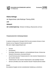 "content": "SCHLESWIG-HOLSTEINISCHER LANDTAG Drucksache 19/990 19. Wahlperiode 2018-10-09 Kleine Anfrage der Abgeordneten Jette Waldinger-Thiering (SSW) und Antwort der Landesregierung - Ministerin für Bildung, Wissenschaft und Kultur Friesischunterricht in Schleswig-Holstein In welchem Umfang wird im Schuljahr 2018/19 an den einzelnen Schulen in Nord- friesland und auf Helgoland Friesischunterricht erteilt? Bitte wenn möglich aufgeschlüsselt nach: • Schulart • Schulstandort • Schulträger (öffentliche allgemein- und berufsbildende Schulen, Schulen des Dänischen Schulvereins und private Schulen) • Anzahl Wochenstunden Friesischunterricht in den einzelnen Klassenstufen an den einzelnen Schulen • Teilnehmerzahl in den einzelnen Klassenstufen an den jeweiligen Schulen • Zahl der Lehrkräfte, die an den einzelnen Schulen Friesischunterricht erteilen Antwort: Die erbetenen Angaben sind der nachstehenden Aufstellung zu entnehmen:",