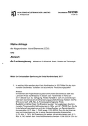 "content": "SCHLESWIG-HOLSTEINISCHER LANDTAG Drucksache 18/5390 18. Wahlperiode 17-04-04 Kleine Anfrage der Abgeordneten Astrid Damerow (CDU) und Antwort der Landesregierung - Ministerium für Wirtschaft, Arbeit, Verkehr und Technologie Mittel für Kreisstraßen-Sanierung im Kreis Nordfriesland 2017 1. In welcher Höhe werden dem Kreis Nordfriesland in 2017 Mittel für den kom- munalen Straßenbau zufließen und aus welcher Finanzierungsquelle? Antwort: Im Rahmen der Projektförderung des kommunalen Straßenbaus stellt das Land dem Kreis Nordfriesland in diesem Jahr Fördermittel in Höhe von 2.411.600,00 Euro zur Verfügung. Hierbei handelt es sich um Zuwendungen nach dem Gemeindeverkehrsfinanzierungsgesetz Schleswig-Holstein (GVFG- SH) sowie nach § 15, Abs. 3, Finanzausgleichsgesetz (FAG). Zusätzlich erhält der Kreis Nordfriesland aus den Vorwegabzügen des kom- munalen Finanzausgleichs Zuweisungen in Höhe von 421.700,00 Euro für die Unterhaltung/Instandsetzung und den Umbau/Ausbau von Gemeindeverbin- dungsstraßen (§ 15, Abs. 1, FAG) sowie 1.939.632,00 Euro für die Unterhal- tung und Instandsetzung der in seiner Baulast stehenden Kreisstraßen (§ 15, Abs. 2, FAG). Als Zuweisung für weitere Infrastrukturlasten nach § 15, Abs. 4, FAG stehen dem Kreis Nordfriesland außerdem 1.596.559,24 Euro zur",