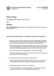 "content": "SCHLESWIG-HOLSTEINISCHER LANDTAG Drucksache 18/136 18. Wahlperiode 2012-09-05 Kleine Anfrage des Abgeordneten Heiner Rickers (CDU) und Antwort der Landesregierung – Minister für Energiewende, Landwirtschaft, Umwelt und ländliche Räume Entlassung des Abteilungsleiters \"Technischer Umweltschutz, Klimaschutz\" 1. Trifft es zu, dass der für den Klimaschutz und die Energiewende zuständige Minister des Landes seinen hierfür verantwortlichen Abteilungsleiter der Abtei- lung „Technischer Umweltschutz, Klimaschutz“ entlassen/versetzt hat? Der Leiter der Abteilung „Technischer Umweltschutz, Klimaschutz“ war bisher nicht für die Aufgaben der Energiewende zuständig. Er wurde zum 01.08.2012 an das Wirtschaftsressort abgeordnet und zum 01.09.2012 dorthin versetzt. Wenn ja, wie lange war der Abteilungsleiter in dieser Funktion tätig? Die Abteilungsleitung „Technischer Umweltschutz, Klimaschutz“ wurde ihm mit Wirkung vom 01.04.2008 übertragen. 2. Was waren die Gründe des Ministers für die Demission? Bei der Versetzung des Abteilungsleiters handelt es sich um eine personal- wirtschaftliche Maßnahme, die im Zuge der Ressortumbildung erfolgt ist. 3. Welche weitere Verwendung ist für ihn vorgesehen? Er ist zum 01.08.2012 zum Leiter der Abteilung 3 „Technologie, Tourismus und Verbraucherschutz“ im Wirtschaftsressort bestellt worden.",