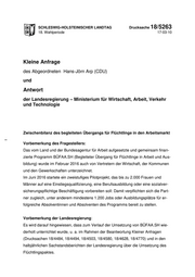 "content": "SCHLESWIG-HOLSTEINISCHER LANDTAG Drucksache 18/5263 18. Wahlperiode 17-03-10 Kleine Anfrage des Abgeordneten Hans-Jörn Arp (CDU) und Antwort der Landesregierung – Ministerium für Wirtschaft, Arbeit, Verkehr und Technologie Zwischenbilanz des begleiteten Übergangs für Flüchtlinge in den Arbeitsmarkt Vorbemerkung des Fragestellers: Das vom Land und der Bundesagentur für Arbeit aufgesetzte und gemeinsam finan- zierte Programm BÜFAA.SH (Begleiteter Übergang für Flüchtlinge in Arbeit und Aus- bildung) wurde im Februar 2016 auch von Vertretern der Wirtschaft, der Kommunen und den Gewerkschaften unterzeichnet. Im Juni 2016 startete ein zweistufiges Pilotprojekt, das bis zu 2.000 Frauen und Männer auf eine Einstiegsqualifizierung, eine Berufsausbildung oder eine sozialver- sicherungspflichtige Beschäftigung vorbereiten soll: Damit verpflichten sich die Part- ner zugleich, unter anderem mindestens 1.200 Jobs oder Ausbildungsplätze für er- folgreiche Absolventinnen und Absolventen des Programms bereit zu stellen. Vorbemerkung der Landesregierung: Es wird darauf hingewiesen, dass zum Verlauf der Umsetzung von BÜFAA.SH wie- derholt unterrichtet wurde, u. a. im Rahmen der Beantwortung Kleiner Anfragen (Drucksachen 18/4484, 18/4494, 18/4503, 18/4580, 18/4628, 18/4770) und in den halbjährlichen Sachstandsberichten der Landesregierung über die Umsetzung des Flüchtlingspaktes.",