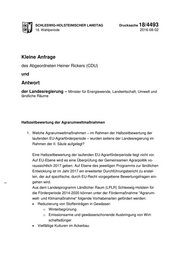 "content": "SCHLESWIG-HOLSTEINISCHER LANDTAG Drucksache 18/4493 18. Wahlperiode 2016-08-02 Kleine Anfrage des Abgeordneten Heiner Rickers (CDU) und Antwort der Landesregierung – Minister für Energiewende, Landwirtschaft, Umwelt und ländliche Räume Halbzeitbewertung der Agrarumweltmaßnahmen 1. Welche Agrarumweltmaßnahmen – im Rahmen der Halbzeitbewertung der laufenden EU-Agrarförderperiode – wurden seitens der Landesregierung im Rahmen der II. Säule aufgelegt? Eine Halbzeitbewertung der laufenden EU-Agrarförderperiode liegt nicht vor. Auf EU-Ebene wird es eine Überprüfung der Gemeinsamen Agrarpolitik vo- raussichtlich 2017 geben. Auf Ebene des jeweiligen Programms zur ländlichen Entwicklung ist im Jahr 2017 ein erweiterter Durchführungsbericht zu erstel- len, der auf spezifische, durch EU-Recht vorgegebene Bewertungsfragen ein- gehen wird. Aus dem Landesprogramm Ländlicher Raum (LPLR) Schleswig-Holstein für die Förderperiode 2014-2020 können unter der Fördermaßnahme \"Agrarum- welt- und Klimamaßnahme\" folgende Vorhabenarten gefördert werden: Reduzierung von Stoffeinträgen in Gewässer: o Winterbegrünung o Emissionsarme und gewässerschonende Ausbringung von Wirt- schaftsdünger Vielfältige Kulturen im Ackerbau",