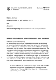 "content": "SCHLESWIG-HOLSTEINISCHER LANDTAG Drucksache 18/3210 18. Wahlperiode 2015-07-22 Kleine Anfrage des Abgeordneten Dr. Axel Bernstein (CDU) und Antwort der Landesregierung – Minister für Inneres und Bundesangelegenheiten Begleitung von Großraum- und Schwertransporten durch private Unternehmen Vorbemerkung der Landesregierung: Die Begleitung von Großraum- und Schwertransporten belastet die Landespolizei seit Jahren über ihre Leistungsfähigkeit hinaus. Diese fachlich nicht vertretbare Be- lastung zu reduzieren, ist der Hintergrund für seit Jahren von Schleswig-Holstein ge- genüber dem Bund und in Bund-Länder-Gremien unternommene Bemühungen, eine Veränderung im Straßenverkehrsrecht des Bundes herbeizuführen. Hierzu gehören auch Überlegungen, die rechtlichen Voraussetzungen für Beleihungen Dritter mit Be- gleitaufgaben zu schaffen. Vor diesem Hintergrund ist es ein in der Wirkung attrakti- ver Gedanke, zu einer Entlastung der Polizei durch den Einsatz von Hilfsbeamtinnen und Hilfsbeamten für Begleitaufgaben beizutragen. Dieser Gedanke bedarf allerdings einer umfassenden verkehrs-, dienst- und gebührenrechtlichen Prüfung, auch in den Bund-Länder-Verkehrsgremien, deren Ergebnisse noch nicht vorliegen. 1. Ist es nach Auffassung der Landesregierung möglich, private Dritte für die Be- gleitung von Großraum- und Schwertransporten zu Hilfsbeamtinnen oder Hilfsbeamten der Polizei gemäß § 10 Abs. 1 Satz 1 Nr. 1 POG zu bestellen und wenn nein, warum nicht?",