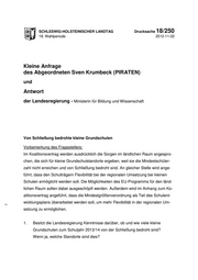 "content": "SCHLESWIG-HOLSTEINISCHER LANDTAG Drucksache 18/250 18. Wahlperiode 2012-11-02 Kleine Anfrage des Abgeordneten Sven Krumbeck (PIRATEN) und Antwort der Landesregierung - Ministerin für Bildung und Wissenschaft Von Schließung bedrohte kleine Grundschulen Vorbemerkung des Fragestellers: Im Koalitionsvertrag werden ausdrücklich die Sorgen im ländlichen Raum angespro- chen, die sich für kleine Grundschulstandorte ergeben, weil sie die Mindestschüler- zahl nicht erreichen und von Schließung bedroht sind. An gleicher Stelle wird ange- führt, dass den Schulträgern Flexibilität bei der regionalen Umsetzung bei kleinen Schulen ermöglicht werden soll. Die Möglichkeiten des EU-Programms für den länd- lichen Raum sollen dabei ausgeschöpft werden. Außerdem wird im Anhang zum Ko- alitionsvertrag angeführt, dass die Mindestgrößenverordnung als Teil des Schulent- wicklungsplans überarbeitet werden soll, um mehr Flexibilität in der regionalen Um- setzung zu ermöglichen. 1. Besitzt die Landesregierung Kenntnisse darüber, ob und wie viele kleine Grundschulen zum Schuljahr 2013/14 von der Schließung bedroht sind? Wenn ja, welche Standorte sind dies?",