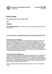 "content": "SCHLESWIG-HOLSTEINISCHER LANDTAG Drucksache 19/1487 19. Wahlperiode 28.05.2019 Kleine Anfrage des Abgeordneten Claus Schaffer (AfD) und Antwort der Landesregierung – Ministerium für Soziales, Gesundheit, Jugend, Familie und Senioren Art und Umfang der Investitionskostenförderung in Schleswig-Holstein Teil III Vorbemerkung des Fragestellers: Die Länder sind gem. § 9 SGB XI verantwortlich für die Vorhaltung einer leistungs- starken, zahlenmäßig ausreichenden und wirtschaftlichen pflegerischen Versor- gungsstruktur. Die Pflegekassen übernehmen allein die Pflegevergütung, in deren Bemessung grundsätzlich keine investiven Kosten einfließen dürfen (vgl.§§ 82 Abs. 2 SGB XI, 2 Nr. 2 KHG). Den Ländern ist ein Wahlrecht zwischen finanziellen Leistun- gen an den Pflegebedürftigen (Subjektförderung) und Zahlungen an die Pflegeein- richtung (Objektförderung) eingeräumt worden. Eine verbindliche Festlegung des Umfangs der Investitionsförderung ist jedoch unterblieben. Die nähere Ausgestaltung ist dem Landesrecht überlassen worden. Vorbemerkung der Landesregierung: In Schleswig-Holstein erfolgt die Förderung der Investitionskosten von Pflegeeinrich- tungen im stationären Bereich (teilstationäre Pflege sowie Kurzzeit- und Langzeit- pflege) durch bewohnerbezogene Zuschüsse, d. h. im Wege der Subjektförderung. In der ambulanten Pflege werden pauschale Investitionskostenzuschüsse an ambulante Pflegedienste zur Abgeltung laufender betriebsnotwendiger Investitionsaufwendun- gen als so genannte Objektförderung gewährt. Wegen des Sachzusammenhanges werden die Fragen 1 und 2 zusammen beant- wortet.",