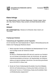 "content": "SCHLESWIG-HOLSTEINISCHER LANDTAG Drucksache 18/575 18. Wahlperiode 13-03-14 Kleine Anfrage der Abgeordneten Jens-Christian Magnussen, Karsten Jasper, Hans- Jörn Arp, Heiner Rickers, Klaus Jensen und Astrid Damerow (CDU) und Antwort der Landesregierung - Ministerium für Wirtschaft, Arbeit, Verkehr und Technologie Projektgruppe Westküste Vorbemerkung der Fragestellerin und der Fragesteller: Am 28. November 2012 hatte Staatssekretär Dr. Nägele im Wirtschaftsausschuss die Initiative einer Projektgruppe Westküste erläutert. 1. Welche regionalen Vertreter sind Mitglieder des Westküstenbeirats? Auf wel- cher Grundlage wurden die Teilnehmer ermittelt? Antwort: Der Beirat zur Westküsteninitiative WKI setzt sich zusammen aus Vertreterin- nen und Vertretern der betroffenen Kreise, der Hochschulen, der regionalen Unternehmensverbände und Kammern, der Gewerkschaften, der Arbeitsver- waltung und regional ansässiger Unternehmen. Die erste Sitzung des Beirats fand am 20.02.2013 in Büsum statt. 2. Wurden die Themen Kraftwerksprojekt Brunsbüttel, Zukunft der Mittelplate, A20, B5, die Pendleranbindung an Hamburg über Straße und Schiene, Ent- wicklung des Tourismus in Friedrichskoog, Ausbau des Brunsbütteler Hafen und Breitbandausbau angesprochen?",