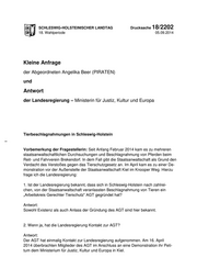"content": "SCHLESWIG-HOLSTEINISCHER LANDTAG Drucksache 18/2202 18. Wahlperiode 05.09.2014 Kleine Anfrage der Abgeordneten Angelika Beer (PIRATEN) und Antwort der Landesregierung – Ministerin für Justiz, Kultur und Europa Tierbeschlagnahmungen in Schleswig-Holstein Vorbemerkung der Fragestellerin: Seit Anfang Februar 2014 kam es zu mehreren staatsanwaltschaftlichen Durchsuchungen und Beschlagnahmung von Pferden beim Reit- und Fahrverein Brekendorf. In dem Fall gibt die Staatsanwaltschaft als Grund den Verdacht des Verstoßes gegen das Tierschutzgesetz an. Im April kam es zu einer De- monstration vor der Außenstelle der Staatsanwaltschaft Kiel im Knooper Weg. Hierzu frage ich die Landesregierung: 1. Ist der Landesregierung bekannt, dass sich in Schleswig-Holstein nach zahlrei- chen, von der Staatsanwaltschaft veranlassten Beschlagnahmung von Tieren ein „Arbeitskreis Gerechter Tierschutz“ AGT gegründet hat? Antwort: Sowohl Existenz als auch Anlass der Gründung des AGT sind hier bekannt. 2. Wenn ja, hat die Landesregierung Kontakt zur AGT? Antwort: Der AGT hat einmalig Kontakt zur Landesregierung aufgenommen. Am 16. April 2014 überbrachten Mitglieder des AGT im Anschluss an eine Demonstration ihr Peti- tum dem Ministerium für Justiz, Kultur und Europa in Kiel.",