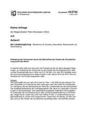 "content": "SCHLESWIG-HOLSTEINISCHER LANDTAG Drucksache 18/2742 18. Wahlperiode 2. März 2015 Kleine Anfrage der Abgeordneten Petra Nicolaisen (CDU) und Antwort der Landesregierung - Ministerium für Soziales, Gesundheit, Wissenschaft und Gleichstellung Entlastung der Kommunen durch die Übernahme der Kosten der Grundsiche- rung durch den Bund In welcher Höhe hätte sich das Land, bei Fortsetzung der bis dahin gängigen Rege- lungen, zur Entlastung der Kommunen an den Kosten der Grundsicherung im Alter und bei Erwerbsminderung in Höhe von 215,192 Mio. € im Jahr 2014 beteiligt, wenn der Bund seine Beteiligung an diesen Kosten in den Jahren 2012 bis 2014 nicht stu- fenweise auf 100 Prozent angehoben hätte. Antwort: Das Land stellte bis zum Jahr 2014 nach § 7 Abs. 1 AG-SGB XII den örtlichen Trä- gern Sozialhilfe zur Finanzierung aller Leistungen nach dem SGB XII Landesmittel zur Verfügung. Bei der Bemessung der Höhe der Landesmittel war die durchschnittli- che Ausgabenentwicklung der vorangegangenen drei Jahre für Leistungen in Einrich- tungen zu berücksichtigen. Eine gesonderte prospektive Kalkulation der Ausgaben für Leistungen der Grundsicherung im Alter und bei Erwerbminderung in Einrichtun- gen, wegen deren Lasten das Land nach Artikel 47 Abs. 2 Landesverfassung aus- gleichspflichtig ist, wurde nicht vorgenommen. Daher kann ein Betrag, mit dem sich das Land an den Kosten der Grundsicherung beteiligt hätte, nicht beziffert werden.",