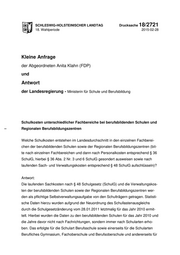 "content": "SCHLESWIG-HOLSTEINISCHER LANDTAG Drucksache 18/2721 18. Wahlperiode 2015-02-28 Kleine Anfrage der Abgeordneten Anita Klahn (FDP) und Antwort der Landesregierung - Ministerin für Schule und Berufsbildung Schulkosten unterschiedlicher Fachbereiche bei berufsbildenden Schulen und Regionalen Berufsbildungszentren Welche Schulkosten entstehen im Landesdurchschnitt in den einzelnen Fachberei- chen der berufsbildenden Schulen sowie der Regionalen Berufsbildungszentren (bit- te nach einzelnen Fachbereichen und dann nach Personalkosten entsprechend § 36 SchulG, hierbei § 36 Abs. 2 Nr. 3 und 6 SchulG gesondert ausweisen sowie nach laufenden Sach- und Verwaltungskosten entsprechend § 48 SchulG aufschlüsseln)? Antwort: Die laufenden Sachkosten nach § 48 Schulgesetz (SchulG) und die Verwaltungskos- ten der berufsbildenden Schulen sowie der Regionalen Berufsbildungszentren wer- den als pflichtige Selbstverwaltungsaufgabe von den Schulträgern getragen. Statisti- sche Daten hierzu wurden aufgrund der Neuordnung des Schullastenausgleichs durch die Schulgesetzänderung vom 28.01.2011 letztmalig für das Jahr 2010 ermit- telt. Hierbei wurden die Daten zu den berufsbildenden Schulen für das Jahr 2010 und die Jahre davor nicht nach Fachrichtungen, sondern immer nach Schularten erho- ben. Das erfolgte für die Schulart Berufsschule sowie einerseits für die Schularten Berufliches Gymnasium, Fachoberschule und Berufsoberschule und andererseits für",