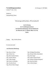 "content": "Vermittlungsausschuss 40. Sitzung (15. WP/2004) (Artikel 77 Abs. 2 GG) Bundesrat Stenografischer Dienst Stenografisches Protokoll der 40. Sitzung des Vermittlungsausschusses des Deutschen Bundestages und des Bundesrates am Mittwoch, den 27. Oktober 2004, 19.15 Uhr Berlin Vorsitz: Abg. Joachim Hörster Es waren anwesend vom Deutschen Bundestag: Abg. Jörg van Essen Abg. Wolfgang Meckelburg Abg. Norbert Geis Abg. Michael Müller (Düsseldorf) Abg. Hans-Joachim Hacker Abg. Krista Sager Abg. Joachim Hörster Abg. Gudrun Schaich-Walch Abg. Volker Kauder Abg. Wilhelm Schmidt (Salzgitter) Abg. Eckart von Klaeden Abg. Jörg-Otto Spiller Abg. Nicolette Kressl Abg. Ludwig Stiegler Abg. Werner Kuhn (Zingst)",
