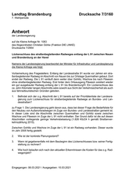 "outline": "- [1. Befindet sich der o.g. Abschnitt der L 91 bereits auf der Prioritätenliste der Landesregierung zum Lückenschluss für straßenbegleitende Radwege an Bundes- und Landesstraßen?](#page-1)\n- [zu Frage 1: Die Landesregierung geht davon aus, dass bei dieser Frage die Bedarfsliste für den Neubau von Außerortsradwegen im Zuge von Bundes- und Landesstraßen gemeint ist. In dieser Liste sind die Abschnitte zwischen Quermathen und Gohlitz sowie zw...](#page-1)\n- [Zwischen Gohlitz und Wachow im Zuge der L 91 ist ein Radweg vorhanden. Dieser wurde im Jahr 2005 fertig gestellt.](#page-1)\n- [2. Wie ist der konkrete Planungsstand?](#page-1)\n- [3. Wann ist gegebenenfalls mit dem Baubeginn des Lückenschlusses bzw. seiner Fertigstellung zu rechnen?](#page-1)\n- [4. Wie hoch belaufen sich nach den aktuellen Erkenntnissen die Kosten für das o.g. Radwegprojekt?](#page-1)\n",