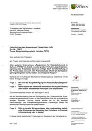 "outline": "- [Kleine Anfrage des Abgeordneten Tobias Keller (AfD)](#page-1)\n- [Drs.-Nr.: 7/2817](#page-1)\n- [Sehr geehrter Herr Präsident,](#page-1)\n- [Frage 1: Wie wird die Bürgerbeteiligung für dieses Großprojekt gestaltet?](#page-1)\n- [Frage 2: Wann beginnt die öffentliche Information der Bürger in Niesky über bereits feststehende Planungen und Absprachen?](#page-1)\n- [Frage 3: Gibt es bereits Bürgerumfragen oder anderweitige statistische Erhebungen zur Akzeptanz des Vorhabens im Freistaat, in Brandenburg oder in Niesky?](#page-1)\n- [Frage 4: Welchen Abstand zur nächsten Wohnbebauung wird das neue Testgelände haben?](#page-2)\n- [Frage 5: Welche Vor- oder auch Nachteile werden sich für die Bürger vor Ort mit Fertigstellung des TETIS ergeben?](#page-2)\n- [Martin Dulig](#page-2)\n",
