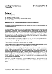 "outline": "- [Frage 1: Welche Erfahrungen haben die Kommunen mit den Neuregelungen der Kommunalverfassung in den vergangenen drei Jahren gemacht?](#page-1)\n- [Frage 2: Welche praktischen Probleme haben sich gezeigt?](#page-1)\n- [Frage 3: Wie haben sich die Regelungen zu den auf kommunaler Ebene zulässigen Bürgerbegehren und Bürgerentscheiden aus Sicht der Kommunen bewährt?](#page-1)\n- [zu den Fragen 1 bis 3: Den nachfolgenden Ausführungen wird vorangestellt, dass entsprechende Angaben der Landesregierung nicht vorliegen. Es besteht keine allgemeine Verpflichtung der Landesregierung, auf Grund parlamentarischer Anfragen die Kommunen ...](#page-1)\n- [Im Rahmen der für die Beantwortung der Kleinen Anfrage erfolgten Abfrage bei den Landräten als untere Kommunalaufsichtsbehörden wurden die nachstehenden Sachverhalte mitgeteilt.](#page-1)\n- [In einem Fall wurde die „geteilte“ Zuständigkeit der kommunalen Vertretung für die Feststellung des Zustandekommens des Bürgerbegehrens und der Kommunalaufsichtsbehörde für die Entscheidung über die Zulässigkeit problematisiert. Vereinzelt wurde beric...](#page-2)\n- [Frage 4: Wie bewertet die Landesregierung die Erfahrungen mit der Neuregelung zur Feststellung der Zulässigkeit eines Bürgerbegehrens, nach § 15 Absatz 2 BbgKVerf?](#page-2)\n- [zu Frage 4: Belastbare Angaben sind hier nicht möglich, da die zuständigen Kommunalaufsichtsbehörden seit dem Inkrafttreten der Regelung nur wenige Zulässigkeitsprüfungen vorzunehmen hatten.](#page-2)\n- [In einem Fall wurde berichtet, dass die gesetzliche Verpflichtung zur unverzüglichen Entscheidung über die Zulässigkeit des Bürgerbegehrens durch die zuständige Kommunalaufsichtsbehörde bei komplexen, inhaltlich und rechtlich schwierigen Sachverhaltsk...](#page-2)\n- [Eine untere Kommunalaufsichtsbehörde hat erklärt, dass die Verlagerung der Zulässigkeitsprüfung auf die Kommunalaufsichtsbehörde nicht erforderlich gewesen sei, da die Kommunen selbst in der Lage wären, eine rechtmäßige Zulässigkeitsentscheidung zu tr...](#page-2)\n- [Bei zwei beim Ministerium des Innern und für Kommunales vorgelegten Bürgerbegehren war festzustellen, dass eine Prüfung der Zulässigkeit wesentlich von der Mitwirkung der betroffenen Kommune abhängig ist. Im konkreten Fall war eine abschließende Bewer...](#page-2)\n- [Frage 5: In welchen Kommunen kam eine solche Entscheidung zum Tragen?](#page-2)\n- [zu Frage 5: Abgeschlossene bzw. begonnene Zulässigkeitsprüfungen betrafen die folgenden Städte und Gemeinden:](#page-2)\n- [ Stadt Falkensee,](#page-2)\n- [ Gemeinde Havelaue,](#page-3)\n- [ Gemeinde Bronkow,](#page-3)\n- [ Gemeinde Lindenau,](#page-3)\n- [ Gemeinde Halenbeck-Rohlsdorf,](#page-3)\n- [ Gemeinde Schöneiche bei Berlin,](#page-3)\n- [ Gemeinde Ziltendorf,](#page-3)\n- [ Stadt Werder (Havel),](#page-3)\n- [ Gemeinde Michendorf (2x),](#page-3)\n- [ Amt Wusterwitz,](#page-3)\n- [ Stadt Treuenbrietzen,](#page-3)\n- [ Stadt Werneuchen,](#page-3)\n- [ Stadt Eberswalde,](#page-3)\n- [ Gemeinde Röderland,](#page-3)\n- [ Gemeinde Birkenwerder sowie](#page-3)\n- [ die Landeshauptstadt Potsdam (2x).](#page-3)\n- [Frage 6: Wie lange haben die entsprechenden Prüfungen der zuständigen Kommunalaufsichtsbehörden jeweils in Anspruch genommen?](#page-3)\n- [zu Frage 6: Die Bearbeitungsdauer variierte von einem Tag (wegen des Fehlens ausreichender Unterstützungsunterschriften) bis zu vier Monaten.](#page-3)\n- [Frage 7: Wie haben die Kommunen die Regelung des § 18 a BbgKVerf zur Beteiligung und Mitwirkung von Kindern und Jugendlichen konkret genutzt?](#page-3)\n- [zu Frage 7: Die Kommunen haben weit überwiegend in ihren Hauptsatzungen Formen zur eigenständigen Mitwirkung von Kindern und Jugendlichen in der Gemeinde bestimmt. Einige Kommunen haben die einzelnen Beteiligungsformen jedoch nicht in der Hauptsatzung...](#page-3)\n- [Frage 8: Mit welchen Formen sichern die Kommunen die Beteiligungsrechte von Kindern und Jugendlichen in allen sie berührenden Gemeindeangelegenheiten?](#page-3)\n- [zu Frage 8: Benannt wurden die folgenden Formen:](#page-3)\n- [ aufsuchendes, direktes Gespräch;](#page-3)\n- [ offene Beteiligung in Form von Diskussionsrunden, Workshops, Konferenzen, Befragungen, Foren;](#page-4)\n- [ projektbezogene, situative Beteiligung in Form von Diskussionsrunden, Workshops, Werkstattverfahren, Befragungen;](#page-4)\n- [ Einladung von Jugendgruppen, örtlichen Vereinen mit Schwerpunkt Kinder- und Jugendarbeit, Schulen oder sonstigen Jugendeinrichtungen in Ausschusssitzungen;](#page-4)\n- [ Durchführung von Jugend-Online-Befragungen zu aktuellen kommunalpolitischen Themen;](#page-4)\n- [ Kinder- und Jugendsprech- oder -fragestunden beim Hauptverwaltungsbeamten oder der Gemeindevertretung;](#page-4)\n- [ Bildung eines Kinder- und Jugendbeirats;](#page-4)\n- [ Einrichtung eines Kinder- und Jugendparlaments;](#page-4)\n- [ Einladung und Anhörung der Schulsprecher zu Sitzungen der Gemeindevertretung;](#page-4)\n- [ Kinder- und Jugendversammlung;](#page-4)\n- [ Aufstellung von Kummer- oder Ideenkasten, digitaler Briefkasten;](#page-4)\n- [ mediengebundene Beteiligungsformen wie gemeindliche Kinder- und Jugendseiten im Internet;](#page-4)\n- [ schriftliche Befragung;](#page-4)\n- [ Öffnung der bestehenden Formen der Einwohnerbeteiligung auch für Kinder und Jugendliche;](#page-4)\n- [ Einrichtung von Arbeitskreisen;](#page-4)\n- [ Diskussionsrunden in den Jugendclubs;](#page-4)\n- [ Schülervertreterkonferenzen;](#page-4)\n- [ Begehungen/Stadtrundgänge;](#page-4)\n- [ Clubrat der Jugendclubs;](#page-4)\n- [ Teilnahme am Bürgerhaushalt;](#page-4)\n- [ Mal- und Zeichenaktionen;](#page-4)\n- [ Stadtforscheraktionen;](#page-4)\n- [ Fotostreifzüge;](#page-4)\n- [ Mitwirkung bei der Planung neuer kinder- und jugendgerechter Freizeitanlagen und Freianlagen an Kindergärten und Schulen;](#page-5)\n- [ Umfragen in den Kinder- und Jugendeinrichtungen;](#page-5)\n- [ Jugend-Budgets;