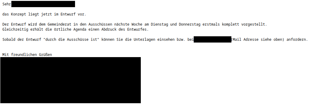 "content": "Antwort an private Email-Adresse:\r\n\r\nSehr [geschwärzt],\r\n\r\ndas Konzept liegt jetzt im Entwurf vor.\r\n\r\nDer Entwurf wird dem Gemeinderat in den Ausschüssen nächste Woche am Dienstag und Donnerstag erstmals komplett vorgestellt.\r\nGleichzeitig erhält die örtliche Agenda einen Abdruck des Entwurfes.\r\n\r\nSobald der Entwurf \"durch die Ausschüsse ist\" können Sie die Unterlagen einsehen bzw. bei [geschwärzt] (Mail Adresse siehe oben) anfordern.\r\n\r\n\r\nMit freundlichen Grüßen\r\n[geschwärzt]",