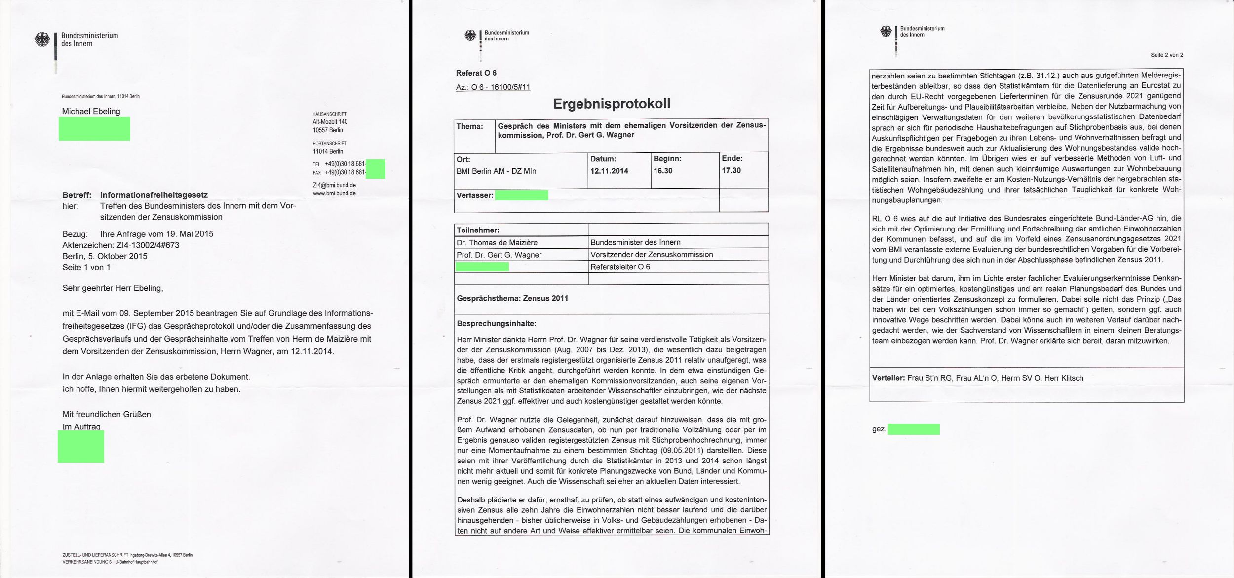 "Antrag nach dem IFG/UIG/VIG\n\nSehr geehrte Damen und Herren, \n\nbitte senden Sie mir Folgendes zu:\n\n- Gesprächsprotokoll und/oder Zusammenfassung des Gesprächsverlaufs und der Gesprächsinhalte vom Treffen von Herrn de Maizière mit dem Vorsitzenden der Zensuskommission, Herrn Wagner, am 12.11.2014.\r\n\r\nBezug:\r\nPressemitteilung des BMI vom 12.11.2014.\r\nhttps://www.bmi.bund.de/SharedDocs/Kurzmeldungen/DE/2014/11/nach-dem-zensus-ist-vor-dem-zensus.html\r\n\r\nBitte beachten Sie:\r\n\r\nSollten Teile meines IFG-Antrags mit etwaigen Kosten verbunden sein, so bitte ich nicht nur um vorherige Benachrichtigung sondern auch um eine davon unabhängige Beantwortung bzw. Erledigung derjenigen Teile dieses Antrags, die nicht mit einer Entstehung von Kosten verbunden sind.\r\n\r\nIch weise hiermit ausdrücklich darauf hin, dass ich keinerlei im Rahmen dieser IFG-Anfrage entstehenden Kosten akzeptieren werde, solange mir diese nicht vor ihrem Entstehen schriftlich angekündigt worden sind und solange ich die Übernahme dieser Kosten nicht schriftlich zugestimmt bzw. diese akzeptiert habe.\r\n\r\nVielen Dank für Ihre Arbeit und Bemühungen mit meiner IFG-Anfrage!\n\nDies ist ein Antrag auf Aktenauskunft nach § 1 des Gesetzes zur Regelung des Zugangs zu Informationen des Bundes (IFG) sowie § 3 Umweltinformationsgesetz (UIG), soweit Umweltinformationen im Sinne des § 2 Abs. 3 UIG betroffen sind, sowie § 1 des Gesetzes zur Verbesserung der gesundheitsbezogenen Verbraucherinformation (VIG), soweit Informationen im Sinne des § 1 Abs. 1 VIG betroffen sind.\n\nAusschlussgründe liegen meines Erachtens nicht vor.\n\nSollte die Aktenauskunft Ihres Erachtens gebührenpflichtig sein, möchte ich Sie bitten, mir dies vorab mitzuteilen und dabei die Höhe der Kosten anzugeben. Meines Erachtens handelt es sich um eine einfache Auskunft. Gebühren fallen somit nach § 10 IFG bzw. den anderen Vorschriften nicht an.\n\nIch verweise auf § 7 Abs. 5 IFG/§ 3 Abs. 3 Satz 2 Nr. 1 UIG/§ 4 Abs. 2 VIG und bitte Sie, mir die erbetenen Informationen so schnell wie möglich, spätestens nach Ablauf eines Monats zugänglich zu machen.\n\nSollten Sie für diesen Antrag nicht zuständig sein, bitte ich Sie, ihn an die zuständige Behörde weiterzuleiten und mich darüber zu unterrichten.\n\nIch bitte Sie um eine Antwort in elektronischer Form (E-Mail) gemäß § 8 EGovG. Eine Antwort an meine persönliche E-Mail-Adresse bei meinem Telekommunikationsanbieter FragDenStaat.de stellt keine öffentliche Bekanntgabe des Verwaltungsaktes nach § 41 VwVfG dar.\n\nIch behalte mir vor, nach Eingang Ihrer Auskünfte gegebenfalls um weitere ergänzende Auskünfte nachzusuchen.\n\nIch möchte Sie um eine Empfangsbestätigung bitten und danke Ihnen für Ihre Mühe!\n\nMit freundlichen Grüßen,\n\nMichael Ebeling\n"