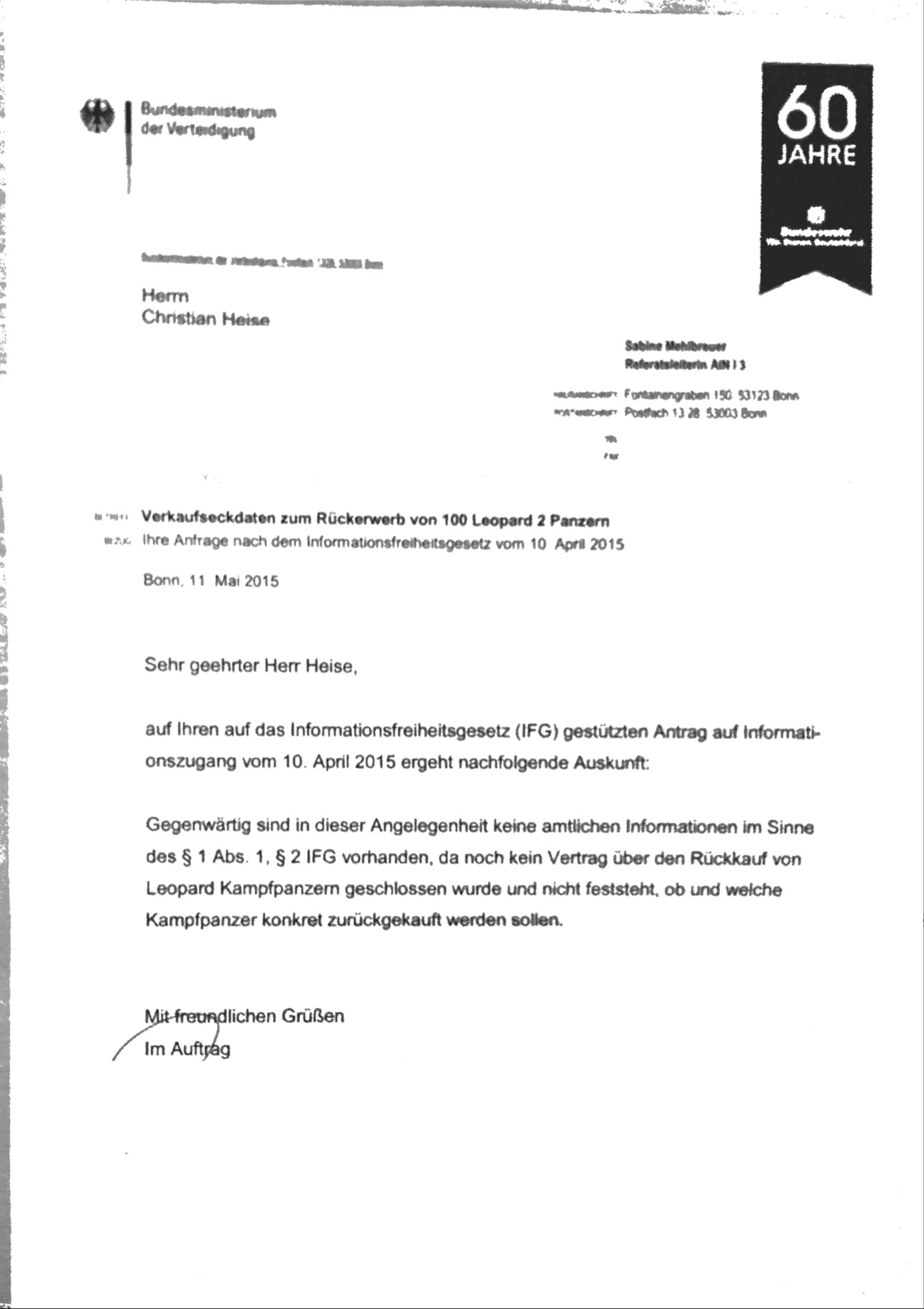 "\"Gegenwärtig sind in dieser Angelegenheit keine amtlichen Informationen im Sinne des §1 Abs. 1, § 2 IFG vorhanden, da noch kein Vertrag über den Rückkauf von Leopard Kampfpanzern geschlossen wurde und nicht feststeht, ob und welche Kampfpanzer konkret zurückgekauft werden sollen.\""