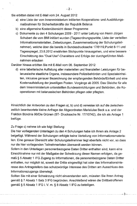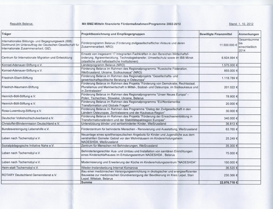 "Ihre IFG-Anfrage vom 06.09.2012 zu Fördermaßnahmen Belarus "