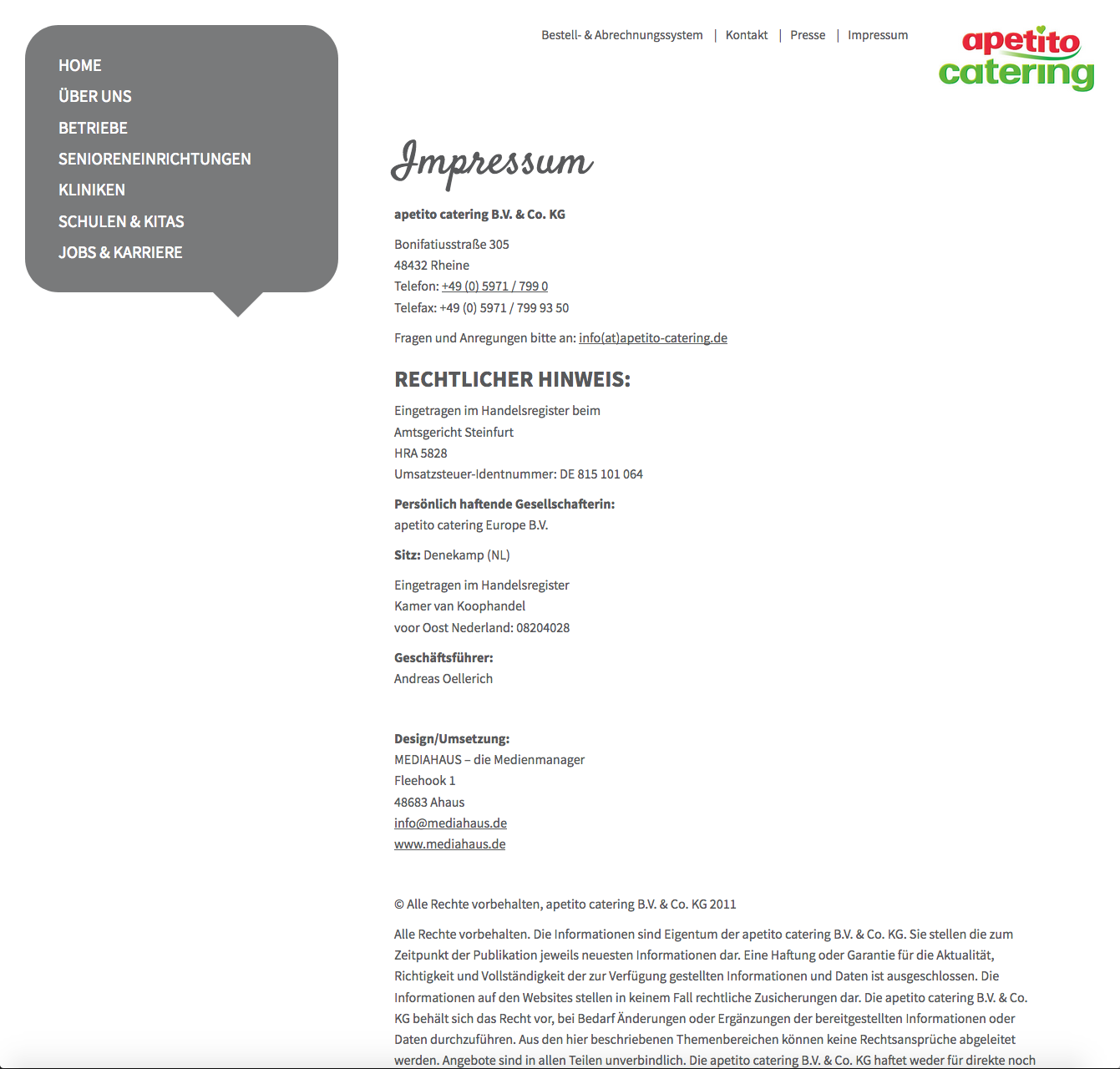 ">\nvielen Dank für Ihre Kontaktaufnahme und Rückfrage.\n\nIm Impressum des Unternehmens wird die von mir angegebene Adresse als Sitz in Deutschland genannt: Bonifatiusstraße 305, 48432 Rheine. Sehen Sie bitte selbst: https://www.apetito-catering.de/impressum/\n\nDort ist auch zu lesen, dass der Sitz der Gesellschaft apetito catering Europe B.V. in Denekamp, Niederlanden liegt.\n\nMit freundlichen Grüßen\n"