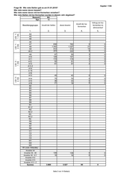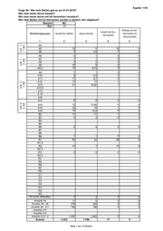 Kapitel: 1105 Frage 59: Wie viele Stellen gab es am 01.01.2018? Wie viele waren davon besetzt? Wie viele waren davon mit kw-Vermerken versehen? Wie viele Stellen mit kw-Vermerken wurden in diesem Jahr abgebaut? Ressort: MJ Epl.: 11 Vollzug von kw‐ Anzahl der kw‐ Besoldungsgruppe Anzahl der Stellen davon besetzt Vermerken im Vermerken Jahresverlauf 1. 2. 3. 4. 5. LGr. 1 - A4 A5 1. EA A6 A6 LGr. 1 - A7 836 762 0 0 A8 1.342 1.327 21 0 2. EA A9 512 512 13 0 A9 Z 223 222 6 0 A9 67 55 3 0 A10 128 107 1 0 A11 115 115 2 0 LGr. 2 - A12 52 51 1 0 A13 61 57 2 0 1. EA A13 Z A14 A 15 A16 A13 45 43 0 0 LGr. 2 - A14 75 70 0 0 2. EA A15 36 33 0 0 A16 21 18 0 0 B2 B3 B4 B5 B6 B7 B8 B9 R1 R1 Z R2 R2 Z R3 R3 Z R4 R5 R6 R7 R8 C1 C2 C3 C4 W1 W2 W3 R1 (richtl. Hilfskräfte) Anwärter A4 Anwärter A6 - A8 139 139 0 0 Anwärter A9 - A11 16 16 0 0 Anwärter A12 Anwärter A13 Anwärter A13 + Z Summe 3.668 3.527 49 0 Seite 3 von 14 Seite(n)