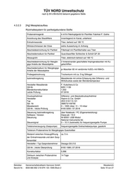 TÜV NORD Umweltschutz nach § 29 b BImSchG bekannt gegebene Stelle 4.3.2.3 [Hg] Messplatzaufbau Rückhaltesystem für partikelgebundene Stoffe: Probenahmegerät 4 m³/h-Filterkopfgerät für Planfilter Fabrikat P. Gothe Anordnung des Staubfilters innenliegend im Kanal, unbeheizt Entnahmesonde Titan, beheizt auf 180 °C Wirkdurchmesser der Düse siehe Auswertung im Anhang Abscheideeinrichtung für Partikel Filterkopf mit Planfilterhalter aus Titan Abscheidemedium für Partikel Quarzfaserfilter Schleicher & Schüll QF 20 Absaugrohr Titan, elektrisch beheizt auf 160 °C Abscheideeinrichtung für filtergän- 2 hintereinander geschaltete Impingerabsorber mit Ku- gige Anteile der Messobjekte gelschliffen Abscheidemedium für filtergängige je Absorber 60 ml verdünnte H2SO4 mit KMnO4 Anteile der Messobjekte Probegastrocknung Trockenturm mit ca. 5 kg Silikagel Isokinetikregelung Messblende mit online Erfassung des Differenz- und Wirkdruckes sowie der Blendentemperatur Hersteller Messblende F. Kutschera & Co QS-Nr. 8291 1139 Blendenkorrekturfaktor 1,002 Letzte Prüfung 07.2018 Druckaufnehmer Differenz- und Absolutdruckaufnehmer Hersteller Haenni & Cie. GmbH Typ ZED 510/113.121 Ser. Nr. 268073/109790 Messbereich 0 – 1000 mbar / 0 – 10 mbar QS-Nr. / letzte Prüfung 8193 0200 / 07.2018 Steuerung Isokinetikregelung über Notebook / PC (Eigenentwicklung) Software / Version DasyLab / 10.0 Steuerung NI 60001 USB Modul National Instruments ltd. Steuersignal 0 – 10 V (Isokinetik) für frequenzgeregelte Pumpe Teilstromerzeugung (Gaspumpe) frequenzgeregelte Drehschieberpumpe, gasdicht Teilstrom-Probenahme für filtergängiges Quecksilber Abstand zwischen Ansaugöffnung ca. 5 m der Entnahmesonde und dem Sorp- tionsmittel Hersteller / Typ Gasprobenehmer Desaga GS 212 QS-Nr. | letzte Überprüfung 8193 1589 | 07.2018 Korrekturfaktor 0,996 Zeitraum zwischen Probenahme 14 Tage und Analyse Betreiber: Gemeinschaftskraftwerk Hannover GmbH Messbericht Bericht Nr.: 8000 666 992/ 218 EFK 135 / EMS Block 2 Seite 19 von 27