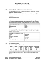 TÜV NORD Umweltschutz nach § 29 b BImSchG bekannt gegebene Stelle 4.3.2.4 [Hg] Behandlung des Abscheidemediums und der Ablagerungen Die Staubfilter werden mit Halter in staubdichter Verpackung (Petrischalen) horizontal gelagert und ins Labor transportiert. Die Absorptionslösungen werden aus jedem Absorber quantitativ in separate Proben- behälter aus PP überführt und verschlossen und dunkel verpackt ins Analysenlabor transportiert. Ablagerungen lagen nicht vor. 4.3.2.5 [Hg] Aufbereitung und Auswertung der Messfilter und der Absorptionslösungen Zur Quantifizierung der Elemente werden die Planfilter gemäß DIN EN 13211 einem Mikrowellenaufschluss unterworfen und die Aufschlusslösungen analytisch vermessen. Hersteller des Mikrowellenofens CEM Typ MARS Aufschlussprogramm SM 1600 W Inv.-Nr. 5300011 Die Aufschlusslösungen und die Absorptionslösungen werden gemäß DIN EN 13211 /43/ mittels Kaltdampf-AAS vermessen. Das Analysenergebnis der letzten Absorptions- stufe wird getrennt ermittelt. Analysengerät Kaltdampftechnik (FIMS) Hersteller Analytik Jena Typ Mercur Plus automatische Fließinjektion Hersteller Perkin-Elmer Typ FIMS 400 elektrisch beheizte Quarzküvette Inv.-Nr. 65100 4.3.2.6 [Hg] Verfahrenskenngrößen Es werden folgende Kenngrößen angegeben: Element Methode Nachweis- Erfassungs- Bestimmungs- Messunsicher- grenze grenze grenze heit Analytik [µg/l] [µg/l] [µg/l] [%] Hg /Lsg FIMS 0,022 0,045 0,089 4,6 Hg / Filter FIMS 0,012 0,025 0,050 4,03 Die benutzten Absorptionslinien stimmen mit den Angaben der DIN 38406, Teil 22 überein. Betreiber: Gemeinschaftskraftwerk Hannover GmbH Messbericht Bericht Nr.: 8000 666 992/ 218 EFK 135 / EMS Block 2 Seite 20 von 27