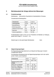 TÜV NORD Umweltschutz nach § 29 b BImSchG bekannt gegebene Stelle 6 Zusammenstellung der Messergebnisse und Diskussion 6.1 Bewertung der Betriebsbedingungen während der Messungen Die Emissionsmessungen wurden bei bestimmungsgemäßen Betrieb des Blocks 2 mit Steinkohle ohne Störungen bei Volllast durchgeführt. Die Dampfleistung lag bei 125 – 126 kg/s. Dies entspricht 96 - 98 % der maximal möglichen Leistung des Kessels. Die Forderung der Nr. 5.3.2.2 TA Luft (höchste Emission) ist erfüllt. 6.2 Messergebnisse Die Volumen- und Konzentrationsangaben bei den im folgenden Abschnitt und in den dazugehörigen Anlagen des Messberichts angegebenen Messergebnissen beziehen sich, soweit nicht ausdrücklich anders angegeben, auf den Normzustand (t = 0 °C, p = 101,3 kPa) und trockenes Gas. Gemäß Nr. 5.1.2 TA Luft wurden die Emissionsmassenkonzentrationen auf den Be- zugswert für den Sauerstoffgehalt von 6 Vol.-% umgerechnet. Die Umrechnung wurde nur für die Messperioden vorgenommen, in denen der gemessene Sauerstoffgehalt größer als der Bezugssauerstoffgehalt war, da eine Abgasreinigungseinrichtung vor- handen ist. In den Anlagen 1 – 4 zu diesem Bericht befinden sich die detaillierten Einzelmess- und Rechenwerte der Messungen. Folgende Symbole werden in den nachfolgenden Tabellen verwendet: EM Emissionskonzentration im Zustand Norm, trocken EB Emissionskonzentration im Bezugszustand (6 Vol.-% O2) Vptf Volumenstrom im Betriebszustand VN,f Volumenstrom im Zustand Norm, feucht VN Volumenstrom im Zustand Norm, trocken Q Massenstrom ELV Grenzwert Mittel Mittelwert Max Maximalwert Betreiber: Gemeinschaftskraftwerk Hannover GmbH Messbericht Bericht Nr.: 8000 666 992/ 218 EFK 135 / EMS Block 2 Seite 24 von 27