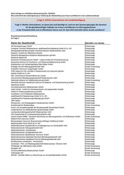 Kleine Anfrage zur schriftlichen Beantwortung (Drs. 18/4222): Was unternimmt die Landesregierung zur Förderung der Gleichstellung von Frauen und Männern in der Landesverwaltung? _Frage 5_FüPoG Unternehmen mit Landesbeteiligung Frage 5: Welche Unternehmen, an denen das Land beteiligt ist, sind von den Quotenregelungen des Gesetzes für die gleichberechtigte Teilhabe von Frauen und Männern an Führungspositionen in der Privatwirtschaft und im öffentlichen Dienst vom 24. April 2015 betroffen (bitte einzeln aufzählen)? Gesamtauswertung Gleichstellung Zu Frage 5 Name der Gesellschaft Betroffen von Gesetz 3N Dienstleistungen GmbH Fehlanzeige Container Terminal Wilhelmshaven JadeWeserPort-Marketing GmbH & Co. KG Fehlanzeige Dachgesellschaft Bauvorhaben Hochschulmedizin Niedersachsen mbH Fehlanzeige Dataport, Anstalt des öffentlichen Rechts Fehlanzeige Deutsche Management-Akademie Niedersachsen gGmbH Fehlanzeige Deutsche Messe AG Fehlanzeige Deutsches Primatenzentrum GmbH - Leibniz-Institut für Primatenforschung Fehlanzeige Deutsches Zentrum für Hochschul- und Wissenschaftsforschung GmbH Fehlanzeige Eisenbahnen und Verkehrsbetriebe Elbe-Weser GmbH Fehlanzeige Endlager Konrad Stiftungsgesellschaft mbH Findet Anwendung Flughafen Hannover-Langenhagen GmbH Fehlanzeige FWU Institut für Film und Bild in Wissenschaft und Unterricht gGmbH Fehlanzeige Galintis GmbH & Co. KG Fehlanzeige GKL Gemeinsame Klassenlotterie der Länder Fehlanzeige Hannoversche Beteiligungsgesellschaft Niedersachsen mbH Fehlanzeige Helmholtz-Zentrum für Infektionsforschung GmbH Findet Anwendung Helmholtz-Zentrum Geesthacht Zentrum für Material- und Küstenforschung GmbH Fehlanzeige IdeenExpo GmbH Fehlanzeige Innovationszentrum Niedersachsen GmbH Fehlanzeige InphA GmbH - Institut für pharmazeutische und angewandte Analytik Fehlanzeige Institut für Solarenergieforschung GmbH Fehlanzeige Investitions- und Förderbank Niedersachsen Fehlanzeige JadeWeserPort Realisierungs GmbH & Co. KG Fehlanzeige JadeWeserPort Realisierungs-Beteiligungs-GmbH Fehlanzeige JWP GmbH Fehlanzeige Klimaschutz- und Energieagentur Niedersachsen GmbH Fehlanzeige Kreditanstalt für Wiederaufbau Findet Anwendung Kunst- und Ausstellungshalle der Bundesrepublik Deutschland GmbH Fehlanzeige Länderzentrum für Niederdeutsch gemeinnützige GmbH Fehlanzeige Landesnahverkehrsgesellschaft Niedersachsen mbH Fehlanzeige LEA Gesellschaft für Landeseisenbahnaufsicht mbH Fehlanzeige Leibniz-Institut DSMZ - Deutsche Sammlung von Mikroorganismen und Zellkulturen GmbH Findet Anwendung Medical Park Hannover GmbH Fehlanzeige Metropolregion Hannover Braunschweig Göttingen Wolfsburg GmbH Fehlanzeige Niedersachsen Ports GmbH & Co. KG Fehlanzeige Niedersächsische Gesellschaft zur Endablagerung von Sonderabfall mbH Fehlanzeige Niedersächsische Hafengesellschaft mbH Fehlanzeige Niedersächsische Landesforsten Fehlanzeige Niedersächsische Landgesellschaft mbH Fehlanzeige Niedersächsische Staatstheater Hannover GmbH Fehlanzeige Niedersächsisches Staatsbad Nenndorf Betriebsgesellschaft mbH Fehlanzeige Niedersächsisches Staatsbad Pyrmont Betriebsgesellschaft mbH Fehlanzeige Norddeutsche Landesbank - Girozentrale - Fehlanzeige nordmedia - Film- und Mediengesellschaft Niedersachsen / Bremen mbH Fehlanzeige PD-Berater der öffentlichen Hand GmbH Findet Anwendung Salzgitter AG Findet Anwendung TourismusMarketing Niedersachsen GmbH Fehlanzeige Volkswagen AG Findet Anwendung ZESAR - Zentrale Stelle zur Abrechnung von Arzneimittelrabatten GmbH Findet Anwendung