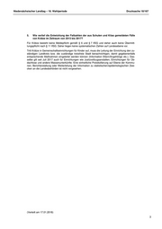 Niedersächsischer Landtag – 18. Wahlperiode Drucksache 18/167 5. Wie verlief die Entwicklung der Fallzahlen der aus Schulen und Kitas gemeldeten Fälle von Krätze im Zeitraum von 2013 bis 2017? Für Krätze besteht keine Meldepflicht gemäß § 6 und § 7 IfSG und daher auch keine Übermitt- lungspflicht nach § 11 IfSG. Daher liegen keine systematischen Zahlen auf Landesebene vor. Tritt Krätze in Gemeinschaftseinrichtungen für Kinder auf, muss die Leitung der Einrichtung den zu- ständigen Landkreis bzw. die zuständige kreisfreie Stadt benachrichtigen, damit gegebenenfalls entsprechende Maßnahmen eingeleitet werden können (Information Eltern/Angehörige etc.). Das- selbe gilt seit Juli 2017 auch für Einrichtungen wie Justizvollzugsanstalten, Einrichtungen für Ob- dachlose und andere Massenunterkünfte. Eine einheitliche Protokollierung auf Ebene der Kommu- nen, Berichterstattung oder Weiterleitung der Information zu statistischen/epidemiologischen Zwe- cken an die Landesbehörden ist nicht vorgesehen. (Verteilt am 17.01.2018) 3