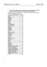 Niedersächsischer Landtag – 17. Wahlperiode Drucksache 17/8494 1. Wie viele rechte Straftaten wurden in Niedersachsen im zweiten Quartal 2017 jeweils polizeilich registriert (bitte auflisten nach Landkreisen/kreisfreien Städten)? In Niedersachsen wurden im zweiten Quartal 2017 266 rechtsmotivierte Straftaten polizeilich regis- triert, die sich regional wie folgt verteilen: Landkreise/Kreisfreie Städte Anzahl Aurich 5 Celle 8 Cloppenburg 1 Cuxhaven 3 Diepholz 6 Emsland 7 Friesland 6 Gifhorn 11 Goslar 6 Göttingen 14 Grafschaft Bentheim 1 Hameln-Pyrmont 4 Hannover, Region 16 Harburg 8 Heidekreis 10 Helmstedt 3 Hildesheim 11 Holzminden 2 Leer 4 Lüchow-Dannenberg 4 Lüneburg 5 Nienburg (Weser) 5 Northeim 9 Osnabrück 10 Osterholz 1 Peine 3 Rotenburg (Wümme) 4 Schaumburg 2 Stade 4 Uelzen 1 Vechta 2 Verden 10 Wesermarsch 1 Wittmund 1 Wolfenbüttel 5 Braunschweig, Kreisfreie Stadt 19 Delmenhorst, Kreisfreie Stadt 1 Emden, Kreisfreie Stadt 3 Hannover, Landeshauptstadt 23 Oldenburg(Oldb), Kreisfreie Stadt 3 Osnabrück, Kreisfreie Stadt 7 Salzgitter, Kreisfreie Stadt 3 Wilhelmshaven, Kreisfreie Stadt 12 Wolfsburg, Kreisfreie Stadt 2 Summe 266 2
