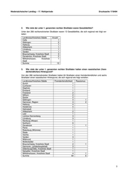 Niedersächsischer Landtag – 17. Wahlperiode Drucksache 17/8494 2. Wie viele der unter 1. genannten rechten Straftaten waren Gewaltdelikte? Unter den 266 rechtsmotivierten Straftaten waren 13 Gewaltdelikte, die sich regional wie folgt ver- teilen: Landkreise/Kreisfreie Städte Anzahl Celle 1 Göttingen 2 Harburg 1 Hildesheim 1 Lüneburg 1 Verden 1 Braunschweig, Kreisfreie Stadt 3 Osnabrück, Kreisfreie Stadt 2 Wilhelmshaven, Kreisfreie 1 Stadt Summe 13 3. Wie viele der unter 1. genannten rechten Straftaten hatten einen rassistischen (frem- denfeindlichen) Hintergrund? Von den 266 rechtsmotivierten Straftaten hatten 64 Straftaten einen fremdenfeindlichen und sechs Straftaten einen rassistischen Hintergrund, die sich regional wie folgt verteilen: Landkreise/Kreisfreie Städte Fremdenfeindlichkeit Rassismus Aurich 1 Cuxhaven 1 Diepholz 1 Emsland 1 Friesland 2 Gifhorn 2 Goslar 2 Göttingen 4 1 Hannover, Region 3 2 Harburg 4 Heidekreis 5 Helmstedt 1 Hildesheim 2 Leer 1 Lüchow-Dannenberg 3 Lüneburg 3 Nienburg (Weser) 1 Northeim 6 Osnabrück 1 1 Peine 1 Rotenburg (Wümme) 1 Stade 1 Vechta 1 Verden 3 Wittmund 1 Wolfenbüttel 1 Braunschweig, Kreisfreie Stadt 2 1 Hannover, Landeshauptstadt 3 Oldenburg(Oldb), Kreisfreie Stadt 1 Salzgitter, Kreisfreie Stadt 1 Wilhelmshaven, Kreisfreie Stadt 4 1 Summe 64 6 3