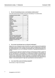 Niedersächsischer Landtag – 17. Wahlperiode Drucksache 17/8494 4. Wie viele Tatverdächtige konnten zu den Straftaten ermittelt werden? Zu den 266 rechtsmotivierten Straftaten konnten 65 Tatverdächtige (TV) ermittelt werden. Landkreise/Kreisfreie Städte Anzahl TV Cuxhaven 3 Emsland 1 Goslar 6 Göttingen 6 Hameln-Pyrmont 1 Hannover, Region 2 Harburg 3 Heidekreis 1 Hildesheim 5 Leer 1 Lüchow-Dannenberg 1 Lüneburg 5 Northeim 7 Osnabrück 2 Rotenburg (Wümme) 2 Schaumburg 1 Stade 2 Vechta 1 Verden 1 Braunschweig, Kreisfreie Stadt 3 Hannover, Landeshauptstadt 4 Oldenburg(Oldb), Kreisfreie Stadt 4 Wilhelmshaven, Kreisfreie Stadt 2 Wolfsburg, Kreisfreie Stadt 1 Summe 65 5. Zu wie vielen Verurteilungen kam es im Zuge der Ermittlungen? Aufgrund der kurzen Zeitspanne seit dem Verstreichen des zweiten Quartals sind die polizeilichen Ermittlungen sowie die justiziellen Verfahren noch nicht in jedem Fall abgeschlossen. Mitteilungen der Staatsanwaltschaften an die zuständige Polizeidienststelle über Verfahrenseinstellungen bzw. Verfahrensausgänge sind noch nicht vollständig im polizeilichen Vorgangsbearbeitungssystem ein- gepflegt. Auf Ebene der Justiz erfolgt keine statistische Erfassung rechtsmotivierter Straftaten, weshalb die justiziellen Statistiken diese nicht ausweisen. Es ist daher aus den Statistiken nicht ersichtlich, ge- gen wie viele Personen im Zusammenhang mit rechtsmotivierte Straftaten Ermittlungsverfahren eingeleitet sowie Hauptverfahren eröffnet worden sind und Verurteilungen erfolgten. Eine Erfas- sung der wegen rechtsmotivierter Straftaten eingeleiteten und beendeten Ermittlungsverfahren er- folgt bei den Staatsanwaltschaften, die das erhobene Zahlenmaterial jährlich dem Justizministerium mitteilen. Für das zweite Quartal 2017 liegen dem Justizministerium noch keine Zahlen vor. 6. In wie vielen Fällen wurde die Ermittlung eingestellt? Auf die Antwort zu Frage 5 wird verwiesen. 4 (Ausgegeben am 24.07.2017)
