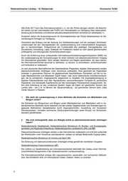 Niedersächsischer Landtag – 18. Wahlperiode Drucksache 18/393 Niedersächsisches Ministerium für Wirtschaft, Arbeit und Verkehr (MW) Grundsätzlich können sich Unbefugte nicht ohne Begleitung Bediensteter in den Dienstgebäuden bewegen. Besonders sensible datenschutzrelevante Unterlagen werden in verschlossenen Räu- men und Schränken aufbewahrt. Zugriff haben nur befugte Personen. Landesamt für Bergbau, Energie und Geologie (LBEG) Alle Beschäftigten sind durch die Grundstücks- und Hausordnung angehalten, ihre Dienstzimmer, Labore und die anderen Räumlichkeiten, die zur Aufgabenerledigung genutzt werden (wie z. B. Rechnerräume, Besprechungsräume), jederzeit vor unbefugtem Eindringen zu sichern. Dafür exis- tieren u. a. Schlüssel, die nach Verlassen der Dienststelle in gesicherten Schlüsselkästen aufbe- wahrt werden. Datenschutzrelevante Unterlagen werden in verschlossenen Schränken aufbewahrt. Niedersächsische Landesbehörde für Straßenbau und Verkehr (NLStBV) Datenschutzrelevante Unterlagen werden in verschließbaren Schränken aufbewahrt. Diese stehen im unmittelbaren Sichtbereich der jeweiligen Sachbearbeitung. Auf dem Dienstweg werden Unter- lagen mit diesbezüglichen Inhalten nur in verschlossenen Umlaufmappen versandt. Archivierte Un- terlagen befinden sich in verschlossenen Kellern, deren Zugang nur ausgesuchtem Personal mög- lich ist. Landesbetrieb für Mess- und Eichwesen (MEN) Für den Umgang mit Datenschutz und IT-Sicherheit im Innen- sowie Außendienst gibt es Dienst- anweisungen und Dienstvereinbarungen. Materialprüfanstalt (MPA) Braunschweig Die Mitarbeiterinnen und Mitarbeiter sind angewiesen, keine Unterlagen in öffentlichen Bereichen dauerhaft oder vorübergehend zu lagern. Büros sind beim Verlassen abzuschließen. Arbeitsplatz- rechner müssen gesperrt werden und können nur durch die Eingabe eines Passworts wieder ent- sperrt werden. Die Zugriffsberechtigungen für Datenbestände sind so gestaltet, dass nur Personen Zugriff haben, die damit innerhalb einer Arbeitsgruppe fachlich befasst sind. Materialprüfanstalt (MPA) Hannover Zugriff haben nur Berechtigte mit entsprechenden Passwörtern und Schlüsselberechtigungen. Niedersächsisches Ministerium für Ernährung, Landwirtschaft und Verbraucherschutz (ML) Der Zutritt zu besonders zu schützenden Gebäudeteilen und Räumen, wo datenschutzrelevante Unterlagen abgelegt sind, ist durch besondere Schließungen oder Freischaltungen bei elektronisch verschlossenen Zugängen geregelt. Nur autorisierte Bedienstete haben Zugang. Soweit dies aus organisatorischen oder baulichen Gründen nicht angezeigt ist, werden diese Unterlagen in ab- schließbaren Metallschränken verwahrt. Niedersächsisches Justizministerium (MJ) Der Zutritt zu den Justizgebäuden einschließlich des Justizministeriums und die Absicherung von nichtöffentlichen Gebäudeteilen werden durch die jeweilige Behördenleitung individuell nach den örtlichen Bedürfnissen durch eine Hausordnung geregelt. Hinsichtlich der IT-Sicherheit sind folgende Regelungen getroffen: Sämtliche in der niedersächsischen Justiz eingesetzten IT-Geräte sind in der Regel durch ein Pass- wort gegen unberechtigten Zugang gesichert. Die Anwenderinnen und Anwender haben bei Ver- lassen des Arbeitsplatzes ihre IT-Geräte zu sperren, sodass ein erneuter Zugang nur mittels eines Passworts möglich ist. Die auf den Datenträgern der Clientsysteme abgelegten Daten der Justiz werden zum einen lokal durch einen Behörden-Server und zum anderen zentral durch Justizserver (sogenannte HUB-Sites) gespeichert und damit vor unbefugtem Zugriff und Elementarschäden gesichert. 4