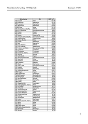 Niedersächsischer Landtag – 17. Wahlperiode Drucksache 17/6771 Schulname Ort BPP in % GS Borgloh Hilter 101,8 HS Bramsche Bramsche 101,5 RS Bramsche Bramsche 98,5 IGS Bramsche Bramsche 103,5 GOBS Buer Melle 101,2 GS Christophorus (kath.) Bohmte 100,0 FöS-LE Comenius Georgsmarienhütte 99,2 GS Dissen Dissen 94,2 RS Dissen Dissen 101,3 HS Dissen Dissen aTW 93,8 GS Droeper-Schule (kath.) Georgsmarienhütte 103,4 GS Eggermühlen Eggermühlen 98,2 GS Eicken-Bruche Melle 100,7 GS Engter Bramsche 100,8 GS Epe Bramsche 100,9 GS Erich Kästner Bohmte 109,1 GS Erich Kästner Wallenhorst 103,4 GS Freiherr vom Stein Georgsmarienhütte 106,9 GS Fürstenau Fürstenau 92,7 IGS Fürstenau Fürstenau 98,5 GS Fürstenau (kath.) Fürstenau 96,6 GS Gehrde Gehrde 96,7 GS Gellenbeck Hagen 100,4 RS Georgsmarienhütte Georgsmarienhütte 100,0 GS Gesmold Melle 87,9 GS Glandorf Glandorf 89,5 OBS Glandorf Glandorf 109,8 GS Glane Bad Iburg 102,1 GS Graf Ludolf Georgsmarienhütte 100,5 GS Grafeld Grafeld 82,3 GY Greselius Bramsche 99,4 GS Grönenbergschule Melle 103,7 OBS Hagen Hagen 91,2 OBS Hasbergen Hasbergen 103,7 FöS-LE Hasetal Quakenbrück 88,5 GS Hengelage Quakenbrück 92,6 GS Herringhausen Bohmte 124,5 GS Hesepe Bramsche 105,9 OBS Hilter Hilter 96,6 GS Hüggelschule Hasbergen 98,3 GS im Engelgarten (kath.) Melle 99,8 GS im Hülsen Neuenkirchen 91,7 GS im Sande Bramsche 100,7 GS Johannesschule Rieste 107,2 GS Johannisschule Wallenhorst 99,1 GS Kantor-Wiebold Melle 101,6 GS Katharinaschule Wallenhorst 97,6 GS Keding Kettenkamp 96,0 GS Lechtingen Wallenhorst 102,4 GS Lintorf Bad Essen 102,1 GS Martinusschule (kath.) Bramsche 98,0 GY Melle Melle 100,6 IGS Melle Melle 96,6 OBS Melle-Mitte Melle 104,6 OBS Melle-Neuenkirchen Melle 88,9 GS Menslage Menslage 91,2 GS Merzen Merzen 97,3 3