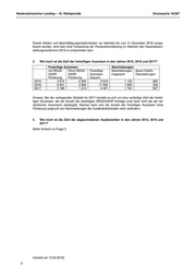 Niedersächsischer Landtag – 18. Wahlperiode Drucksache 18/307 Kleine Anfrage zur schriftlichen Beantwortung mit Antwort der Landesregierung Anfrage des Abgeordneten Christopher Emden (AfD) Antwort des Niedersächsischen Justizministeriums namens der Landesregierung Asylverfahren Anfrage des Abgeordneten Christopher Emden (AfD), eingegangen am 22.01.2018 - Drs. 18/239 an die Staatskanzlei übersandt am 30.01.2018 Antwort des Niedersächsischen Justizministeriums namens der Landesregierung vom 14.02.2018, gezeichnet Barbara Havliza Vorbemerkung des Abgeordneten Die Zahlen der verwaltungsgerichtlichen Verfahren gegen ablehnende Asylbescheide sind nach Angaben der Online-Ausgabe der Süddeutschen Zeitung vom 18.09.2017 und der Online-Ausgabe der Frankfurter Allgemeinen Zeitung vom 02.11.2017 deutlich angestiegen. 1. Wie viele verwaltungsgerichtliche Verfahren gegen ablehnende Asylbescheide gab es in den Jahren 2015, 2016 und 2017? Bei den Asylkammern der niedersächsischen Verwaltungsgerichte sind eingegangen: 2015: 5 267 Klagen und 3 953 Verfahren zur Gewährung von vorläufigem Rechtsschutz, 2016: 11 020 Klagen und 4 685 Verfahren zur Gewährung von vorläufigem Rechtsschutz sowie 2017: 22 163 Klagen und 5 512 Verfahren zur Gewährung von vorläufigem Rechtsschutz. 2. Wie begegnet die Landesregierung dem erhöhten Aufwand an den Gerichten? Zur Bewältigung der flüchtlingsbedingten Mehrbelastung wurden die niedersächsischen Verwal- tungsgerichte über den 1. Nachtragshaushalt 2015 sowie mit dem Haushalt 2016 im Umfang von insgesamt 62 Stellen bzw. Beschäftigungsmöglichkeiten (30 Richterstellen sowie 32 Stellen und Beschäftigungsmöglichkeiten in den Folgediensten) personell verstärkt. Die Bereitstellung dieser Stellen und Beschäftigungsmöglichkeiten erfolgte zunächst befristet bis zum 31. Dezember 2018. Weitere insgesamt 50 Stellen und Beschäftigungsmöglichkeiten (24 Richterstellen sowie 26 Stellen bzw. Beschäftigungsmöglichkeiten in den Folgediensten) können von den niedersächsischen Ver- waltungsgerichten ebenfalls bis Ende des Jahres 2018 im Rahmen einer Überschreitungsermächti- gung genutzt werden. Darüber hinaus wurden der Verwaltungsgerichtsbarkeit aus einem zentral im Ministerialkapitel ver- anschlagten Stellenkontingent elf Richterstellen zur Verfügung gestellt. Auch diese Maßnahme er- folgte zunächst befristet bis zum 31. Dezember 2018. Damit stehen den niedersächsischen Verwaltungsgerichten aktuell insgesamt 123 zusätzliche Stel- len und Beschäftigungsmöglichkeiten zur Bewältigung der Asyl-Klageverfahren zur Verfügung. Im Richterbereich wurden die o. g. Stellen zu einem Teil für Neueinstellungen, zu einem anderen Teil für Abordnungen aus anderen Gerichtsbarkeiten genutzt. 1