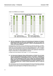 Niedersächsischer Landtag – 17. Wahlperiode Drucksache 17/8857 Screeningbefund in der Schuleingangsuntersuchung nicht mit einer tatsächlichen Diagnose gleich- gesetzt werden. In Niedersachsen begann im Jahr 2016 eine Vielzahl der Kommunen, im Rahmen der Schulein- gangsuntersuchung neue Testverfahren für die Überprüfung der Sprachentwicklung und zur Erfas- sung der kognitiven Fähigkeiten (Zahlen und Mengenverständnis) einzuführen. Zusätzlich haben mehrere Kommunen ihre Untersuchung um weitere Tests im Rahmen der sozialpädiatrischen Ent- wicklung ergänzt. Damit die Daten valide und landesweit vergleichbar sind, müssen sie einem Qua- litätsanspruch genügen, der erst durch Routine, Erfahrung und Austausch innerhalb und zwischen den untersuchenden Teams möglich wird. Dieser Prozess läuft derzeit. 10. Wann ist mit der Veröffentlichung der landesweiten Daten der Schuleingangsuntersu- chungen der Jahre 2015, 2016 und 2017 zu rechnen? Der letzte Bericht zu den Daten der Schuleingangsuntersuchungen auf Landesebene wurde mit den Daten des Einschulungsjahrgangs 2014 erstellt. Für die Jahre 2015 und 2016 hat das NLGA die Auswertungen auf Kreisebene durchgeführt, den Kommunen zurückgespiegelt und an Hand vergleichender Auswertungen die Ergebnisse auf den Anwendertreffen zwecks Qualitätssicherung zur Diskussion gestellt. Mit den Daten des Einschulungsjahrgangs 2017 soll der nächste landeswei- te Bericht erstellt werden. Als Erscheinungszeitraum ist das dritte Quartal 2018 vorgesehen. Wegen der aktuell für einige Untersuchungsitems unterschiedlichen Testverfahren werden für diese Items getrennte Auswertungen erfolgen. 11. Geben die landesweiten Ergebnisse der Schuleingangsuntersuchungen der letzten vier Jahre Anlass zu der Annahme, dass der Anteil der einzuschulenden Kinder zunimmt, der aufgrund von Bewegungsmangel in der frühen Kindheit Auffälligkeiten zeigt? Für die Beantwortung der Frage kann auf Landeseben nur auf die Daten der Ganzkörperkoordina- tion (Grobmotorik) zurückgegriffen werden. Die Ganzkörperkoordination wird im Rahmen der Schu- leingangsuntersuchung durch das beidbeinige Seitwärtshüpfen geprüft. Diese kann ergänzt bzw. ersetzt werden durch monopedales Hüpfen, Einbeinstand, Balancieren und das Fangen eines Bal- les. Zur Auswertung der grobmotorischen Entwicklung wird auf die Antwort zu Frage 12 b verwie- sen. 12. Wie hat sich auf Basis der landesweiten Daten der Schuleingangsuntersuchung in den letzten vier Jahren der Anteil der Kinder entwickelt, der Auffälligkeiten in Bezug auf a) Über-/Untergewicht (BMI) oder In den vergangenen vier Jahren sind keine nennenswerten Veränderungen bezüglich des Anteils von Schulanfängerinnen und Schulanfängern mit Übergewicht/Adipositas bzw. Untergewicht/star- kem Untergewicht zu verzeichnen. Sowohl der Anteil der Kinder mit Übergewicht/Adipositas als auch der Anteil der Kinder mit Untergewicht/starkem Untergewicht liegen um die 10 %. Geschlechtsspezifische Unterschiede bei der Häufigkeit von Übergewicht/Adipositas und Unterge- wicht/starkem Untergewicht zeigen sich bei den Einschulungskindern in Niedersachsen nicht. 8