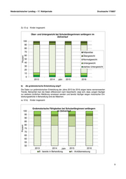 Niedersächsischer Landtag – 17. Wahlperiode Drucksache 17/8857 Zu 12 a) Kinder insgesamt: Über- und Untergewicht bei Schulanfängerinnen/-anfängern im Zeitverlauf 100 90 80 70 Adipositas 60 Übergewicht Prozent 50 Normalgewicht 40 Untergewicht 30 starkes Untergewicht 20 10 0 2013 2014 Jahr 2015 2016 b) die grobmotorische Entwicklung zeigt? Die Daten zur grobmotorischen Entwicklung der Jahre 2013 bis 2016 zeigen keine nennenswerten Trends. Betrachtet man die Daten differenziert nach Geschlecht, zeigt sich, dass Jungen häufiger zur weiteren ärztlichen Abklärung verwiesen werden und bereits häufiger wegen motorischer Ent- wicklungsdefizite in Behandlung sind als Mädchen. zu 12 b) Kinder insgesamt: Grobmotorische Fähigkeiten bei Schulanfänginnen/-anfängern 100 im Zeitverlauf 95 90 85 80 Prozent 75 70 65 60 55 50 2013 2014 Jahr 2015 2016 B - bereits in Behandlung A - Arztüberweisung 9