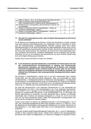 Niedersächsischer Landtag – 17. Wahlperiode Drucksache 17/8857 Bälle ins Wasser - Wie z. B. die Spielesportart Wasserball als Moti- 125 vation im Schwimmunterricht genutzt werden kann x 0 Sport: Aktualisierung bzw. Auffrischung der Rettungsfähigkeit für 126 Sportlehrerinnen und Sportlehrer aller Schulformen (nach der neu- en Erlasslage) x 0 Klettern im Schulsport Modul 2 Vorstiegsklettern - Klettern an 127 künstlichen Kletteranlagen - Modul 2 x 0 Klettern im Schulsport Modul 2 Vorstiegsklettern - Klettern an 128 künstlichen Kletteranlagen - Modul 3 x 0 19. Wie stellt die Landesregierung sicher, dass die tägliche Bewegungszeit an allen Grund- schulen stattfindet? Für die Beratung und Unterstützung der Schulen in Fragen des Schulsports ist in jedem Landkreis sowie jeder kreisfreien Stadt Niedersachsens eine Fachberaterin oder ein Fachberater für Schul- sport der Niedersächsischen Landesschulbehörde (NLSchB) zuständig. Diese führen jährlich Dienstbesprechungen mit den Sport-Fachleitungen der allgemeinbildenden Schulen durch und ge- stalten die sportfachliche Zusammenarbeit zwischen Schulen, Sportvereinen, Sportverbänden und der kommunalen Sportverwaltung. Sie unterstützen die Schulen durch unterrichtsbezogene Bera- tung (Umsetzung Kerncurriculum, schuleigene Arbeitspläne) bei der Entwicklung der Schulpro- grammteile, die sich auf die Gestaltung des Sportunterrichts und seine fachliche Qualität sowie auch auf die tägliche Bewegungszeit beziehen. Darüber hinaus wird auf die Antwort zu Frage 18 a verwiesen. 20. In den Schulformen des Sekundarbereichs I einschließlich der Förderschulen sind nach den schulformspezifischen Grundsatzerlassen je Jahrgang zwei Wochenstunden Sportunterricht vorgesehen, eine dritte Sportstunde soll im Rahmen einer Arbeitsge- meinschaft bereitgestellt werden. Inwieweit werden die Schulen dabei von der Landes- regierung mit geeigneten Konzepten und Vorschlägen zur Umsetzung unterstützt, und inwieweit wird sichergestellt, dass dementsprechende Arbeitsgemeinschaften angebo- ten werden? Der Schulsport im Sekundarbereich I besteht nicht nur aus dem Unterrichtsfach Sport. Vielmehr umfasst dieser auch das außerunterrichtliche Bewegungs-, Spiel- und Sportangebot der Schule und berücksichtigt - in Arbeitsgemeinschaften im Rahmen des Ganztagangebots - die Kooperation mit Sportvereinen und Sportfachverbänden sowie die Talentsichtung und -förderung. Des Weiteren finden sich Elemente des Unterrichts im Fach Sport auch in der Behandlung fächerübergreifender Themen wie u. a. Mobilität sowie Gesundheitsförderung und Prävention wieder. Der Anteil des Sportunterrichts in den Integrierten Gesamtschulen ist in der Stundentafel des Grundsatzerlasses „Die Arbeit in den Schuljahrgängen 5 bis 10 der Integrierten Gesamtschule“ vom 01.08.2014 in Nr. 3.1 geregelt. Für die nach Schulzweigen gegliederte KGS gelten die Stun- dentafeln der entsprechenden Schulformen. In den Schuljahrgängen 5 bis 10 sind jeweils zwei Stunden Sportunterricht zu unterrichten, eine dritte Sportstunde wird im Rahmen von Arbeitsge- meinschaften oder im Rahmen des Ganztags bereitgestellt (o. a. Erlass, Nr. 3.2.13). Da es sich nicht um eine Kann-Formulierung handelt, sodass alle Gesamtschulen Ganztagsschulen sind, kommt dies dem verbindlichen Charakter entgegen. Darüber hinaus können im Rahmen des Wahlpflichtunterrichts in den Schuljahrgängen 7 bis 10 zwei- oder vierstündige Wahlpflichtkurse (WPK) Sport angeboten werden (o. a. Erlass, Nr. 3.2.9). Die Möglichkeit der Vierstündigkeit unterscheidet die Gesamtschule von anderen Schulformen im Sekundarbereich I. In der Regel werden WPK Sport an den niedersächsischen Gesamtschulen eingerichtet. Die Schulen erhalten gemäß Klassenbildungserlass Poolstunden, die u. a. auch für Arbeitsgemein- schaften im Sport verwendet werden können. Darüber hinaus besteht in den Ganztagsangeboten der Schulen eine Vielzahl von Möglichkeiten zur Teilnahme an Angeboten mit sportlicher Ausrich- 23