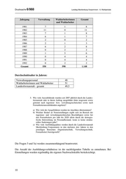 Drucksache 6/988 Landtag Mecklenburg-Vorpommern - 6. Wahlperiode Jahrgang Verwaltung Waldarbeiterinnen Gesamt und Waldarbeiter 1981 7 1 8 1982 11 0 11 1983 7 1 8 1984 6 1 7 1985 2 0 2 1986 2 1 3 1987 6 2 8 1988 0 2 2 1989 1 5 6 1990 0 4 4 1991 0 4 4 1992 0 2 2 Gesamt 550 598 1.148 Durchschnittsalter in Jahren: Verwaltungspersonal 48 Waldarbeiterinnen und Waldarbeiter 51 Landesforstanstalt - gesamt 49,5 5. Wie viele Auszubildende wurden seit 2007 jährlich durch die Landes- forstanstalt oder in ihrem Auftrag ausgebildet (bitte insgesamt sowie getrennt nach ingenieur- bzw. verwaltungstechnischen sowie nach Forstarbeiterauszubildenden angeben)? a) Wie viele der Ausgebildeten wurden im Anschluss übernommen? b) Welcher Bedarf an Neueinstellungen ergibt sich im Bereich der ingenieur- und verwaltungstechnischen Beschäftigten sowie bei den Forstarbeitern pro Jahr bis 2020 allein durch die demogra- fische Entwicklung im Personalbestand, wenn es keine struktu- rellen Änderungen gäbe? c) Wie viele Ausbildungsplätze werden durch die Landesforstanstalt Mecklenburg-Vorpommern in den nächsten drei Jahren in den jeweiligen Bereichen (Ingenieurtechnik, Verwaltungstechnik, Forstarbeiter) bereitgestellt? Die Fragen 5 und 5a) werden zusammenhängend beantwortet. Die Anzahl der Ausbildungsverhältnisse ist der nachfolgenden Tabelle zu entnehmen. Bei Einstellungen wurden regelmäßig die eigenen Nachwuchskräfte berücksichtigt. 10