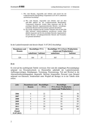 Drucksache 6/988 Landtag Mecklenburg-Vorpommern - 6. Wahlperiode 4 mD: - 01.04.11 – 31.03.13 Bürosachbearbeitung im Projekt „BWI³“ - 16.05.11 – 31.12.11 Bürosachbearbeitung Servicebereich Personal, Organisation, Innerer Dienst, Aus-, Fort- und Weiterbildung - Abwesenheits- vertretung - 15.08.11 – 31.12.11 Bürosachbearbeitung - FoA Conow - 15.08.11 – 31.12.11 Bürosachbearbeitung - FoA Sandhof 6 Waldarbeiter: - 16.07.11 – 31.07.13 FoA Jasnitz 1 Arbeiter: - 18.07.11 – 17.07.14 Fleischer - FoA Schildfeld 2012 1 hD: - 01.06.12 – 31.12.12 stellvertretende Forstamtsleitung - FoA Schlemmin 5 gD: - 01.01.12 – 31.12.13 Sachbearbeitung - Fachgebiet Standortserkundung, Natura 2000 - 09.01.12 – 31.12.12 Sachbearbeitung - FoA Schildfeld - 02.04.12 – 31.12.12 Sachbearbeitung - FoA Neu Pudagla - 01.06.12 – 31.12.12 Sachbearbeitung - FoA Radelübbe - 01.06.12 – 31.05.13 Sachbearbeitung - Fachgebiet Entwicklung und Betrieb IT-gestützter Fachverfahren - Abwesenheitsvertretung 2 mD: - 01.03.12 – 31.12.12 Bürosachbearbeitung - FoA Sandhof - 19.03.12 – 31.12.12 Bürosachbearbeitung - FoA Stavenhagen 4 Waldarbeiter: - 14.07.12 – 13.07.14 2 Waldarbeiter - FoA Jasnitz, - 14.07.12 – 13.07.14 FoA Nossentiner Heide - 14.07.12 – 13.07.14 FoA Neustrelitz 6