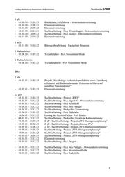 Landtag Mecklenburg-Vorpommern - 6. Wahlperiode Drucksache 6/988 Zu b) Befristete Arbeitsverhältnisse wurden wie folgt vereinbart: 2006 - keine 2007 1 höherer Dienst (hD): - 01.03.07 - 31.07.08 Projekt - Modellierung eines Bildungsprogramms „Nachhaltige Waldbewirtschaftung“ als innovativer Beitrag zum Transfervor- haben „Bildung für eine nachhaltige Entwicklung“ des Forschungsverbundes HOLZ CLUSTER NORD 5 gehobene Dienste (gD): - 29.05.07 – 31.07.07 Elternzeitvertretung - 18.06.07 – 17.02.10 Elternzeitvertretung - 01.08.07 – 10.08.08 Elternzeitvertretung - 28.08.07 – 29.07.08 Elternzeitvertretung - 01.09.07 – 31.08.12 Projekt „Industriestandort Lubminer Heide“ der EWN GmbH 2 mittlere Dienste (mD): - 01.09.07 – 17.02.08 Elternzeitvertretung - 10.12.07 – 31.05.09 Bürosachbearbeitung Forstamt (FoA) Schönberg 2008 3 hD: - 01.06.08 – 31.05.10 Leitung Fachgebiet „Forstliche Rahmenplanung“ als Vertretung für die Zeit der Personalratsfreistellung - 01.08.08 – 15.09.09 Elternzeitvertretung - 01.10.08 – 31.05.09 Elternzeitvertretung 8 gD: - 05.05.08 – 04.05.10 2 gD - Sachbearbeitung - Projekt „Forsteinrichtung“ - 01.10.08 – 30.09.10 3 gD - Sachbearbeitung - Projekt „Forsteinrichtung“ - 01.10.08 – 30.09.10 Sachbearbeitung - FoA Nossentiner Heide - 01.10.08 – 30.09.10 Sachbearbeitung - Fachgebiet Betriebswirtschaft, Controlling - 01.11.08 – 31.12.09 Elternzeitvertretung 3