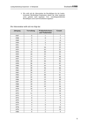 Landtag Mecklenburg-Vorpommern - 6. Wahlperiode Drucksache 6/988 4. Wie stellt sich die Altersstruktur der Beschäftigten bei der Landes- forstanstalt Mecklenburg-Vorpommern aktuell dar (bitte insgesamt sowie getrennt nach ingenieur- bzw. verwaltungstechnischen Beschäftigten sowie nach Forstarbeitern angeben)? Die Altersstruktur stellt sich wie folgt dar: Jahrgang Verwaltung Waldarbeiterinnen Gesamt und Waldarbeiter 1947 6 1 7 1948 5 0 5 1949 5 1 6 1950 6 6 12 1951 5 7 12 1952 7 16 23 1953 8 43 51 1954 14 30 44 1955 18 33 51 1956 13 33 46 1957 31 31 62 1958 30 26 56 1959 26 41 67 1960 26 44 70 1961 30 36 66 1962 28 47 75 1963 34 37 71 1964 21 40 61 1965 25 19 44 1966 34 15 49 1967 25 16 41 1968 18 13 31 1969 16 10 26 1970 10 6 16 1971 9 9 18 1972 11 3 14 1973 5 1 6 1974 8 1 9 1975 4 2 6 1976 4 1 5 1977 5 0 5 1978 7 3 10 1979 8 2 10 1980 6 2 8 9